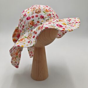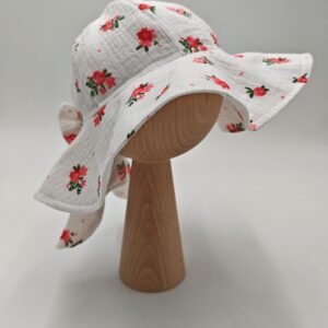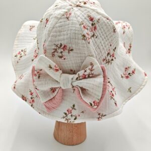 Uroczy kapelusz dla dziewczynki z podwójną kokardą, uszyty z przewiewnego muślinu bawełnianego w drobne różyczki. Idealny na lato. Dostępny w rozmiarach 36–54 cm.