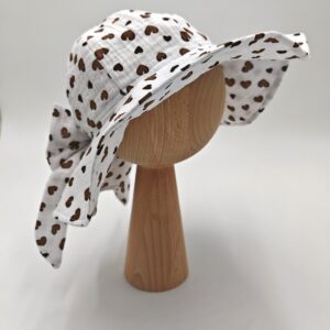 Uroczy kapelusz dla dziewczynki z kokardą, uszyty z przewiewnego muślinu bawełnianego w beżowe serduszka. Idealny na lato. Dostępny w rozmiarach 36–54 cm.