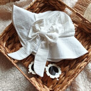 Uroczy kapelusz dla dziewczynki z kokardą, uszyty z przewiewnego muślinu bawełnianego w wybranym kolorze. Idealny na lato. Dostępny w rozmiarach 36–54 cm.