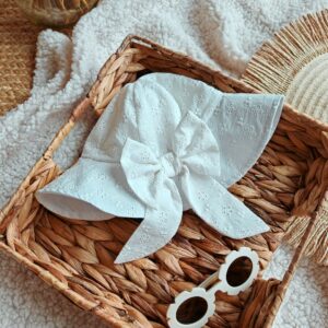 Uroczy kapelusz dla dziewczynki z kokardą, uszyty z przewiewnej bawełny haftowanej. Idealny na lato. Dostępny w rozmiarach 36–54 cm.