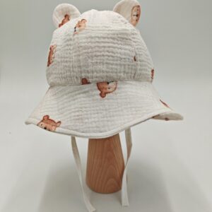 Letni kapelusz muślinowy z uszkami dla chłopca i dziewczynki. Wzór misie na tle ecru.