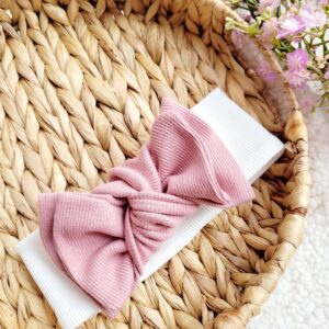 Opaska z podwójną kokardą wykonana z dzianiny prążkowanej w wybranym kolorze.