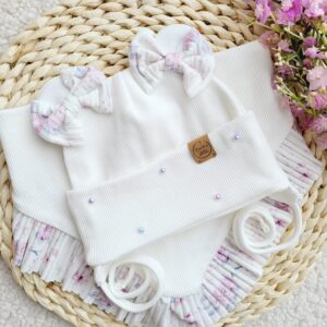 Komplet czapka z uszkami i kokardkami z chustą z falbanką Old Roses