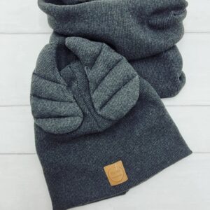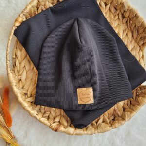 Komplet z dzianiny prążkowanej w kolorze antracytowym. Prosta lub wywijana czapka połączona z kominem.
