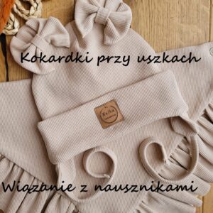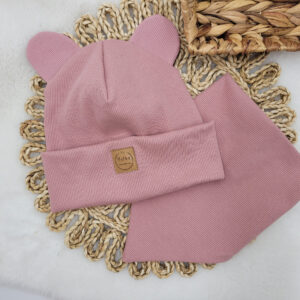 Prosta lub wywijana czapka z dzianiny prążkowanej ozdobiona misiowymi uszami w kolorze brudnego różu. Możliwe wiązanie i dodatkowe kokardki.