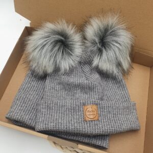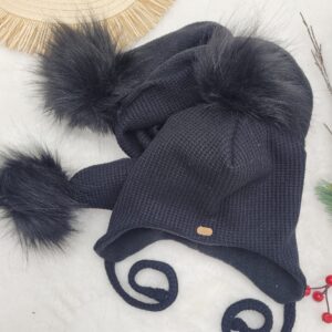 Czapka wiązana z dzianiny sweterkowej w kolorze czarnym, podszyta polarem. Wykończona ręcznie robionymi pomponami w wybranym kolorze.