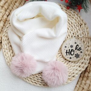 Szalik z dzianiny sweterkowej w kolorze ecru wykończony ręcznie robionymi pomponami w wybranym kolorze. Dostępny w różnych długościach.