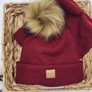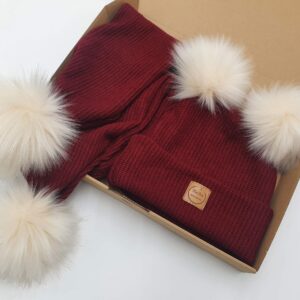 Czapka wiązana z pomponami z dzianiny sweterkowej w kolorze bordowym, podszyta polarem. Jeden lub dwa pompony do wyboru