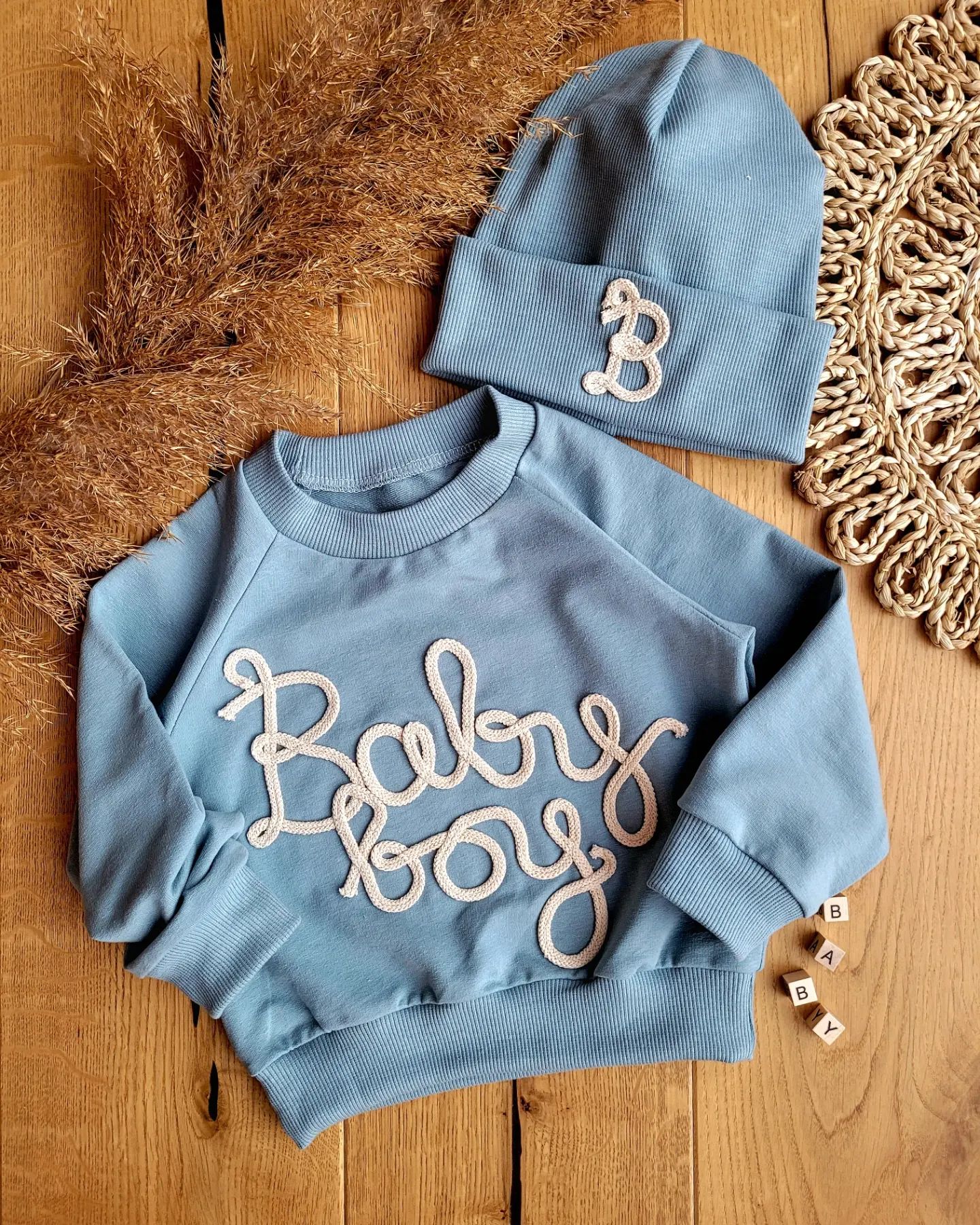 Dzianinowa bluza dla chłopca w wybranym kolorze ozdobiona napisem „Baby boy”.