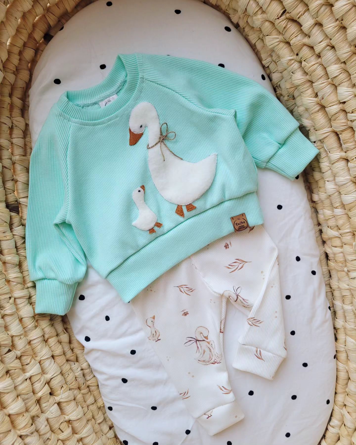 Bluza uszyta z dzianiny prążkowanej w wybranym kolorze z ręcznie wykonaną aplikacją Mamy gąski i gąsiorka w zestawie z legginsami prążkowanymi w tym samym kolorze. W ofercie posiadamy również inne bluzy pasujące do legginsów a także zestawy czapka/komin i kilka modeli opasek. Możesz stworzyć wiele stylizacji na różne okazje.