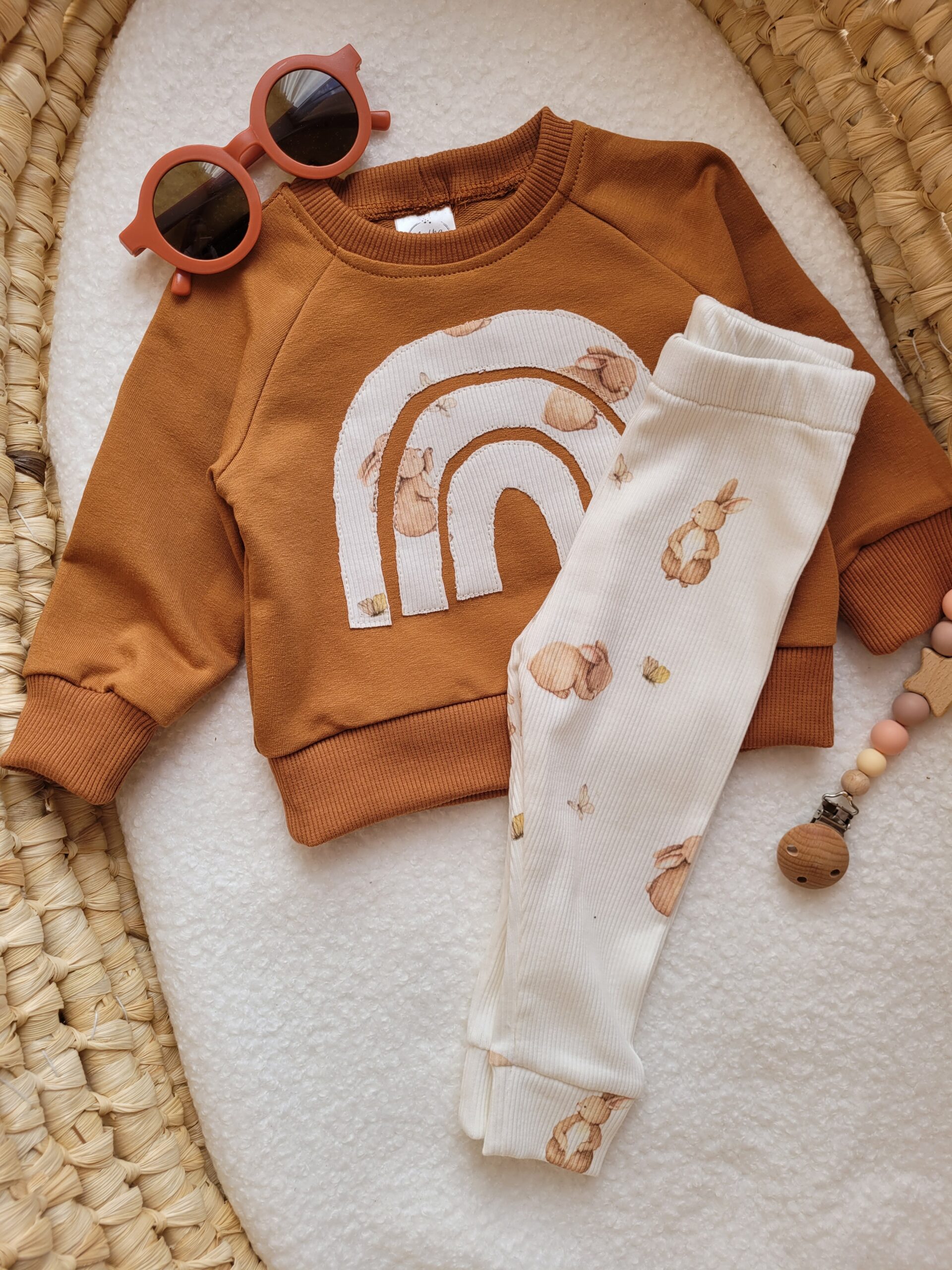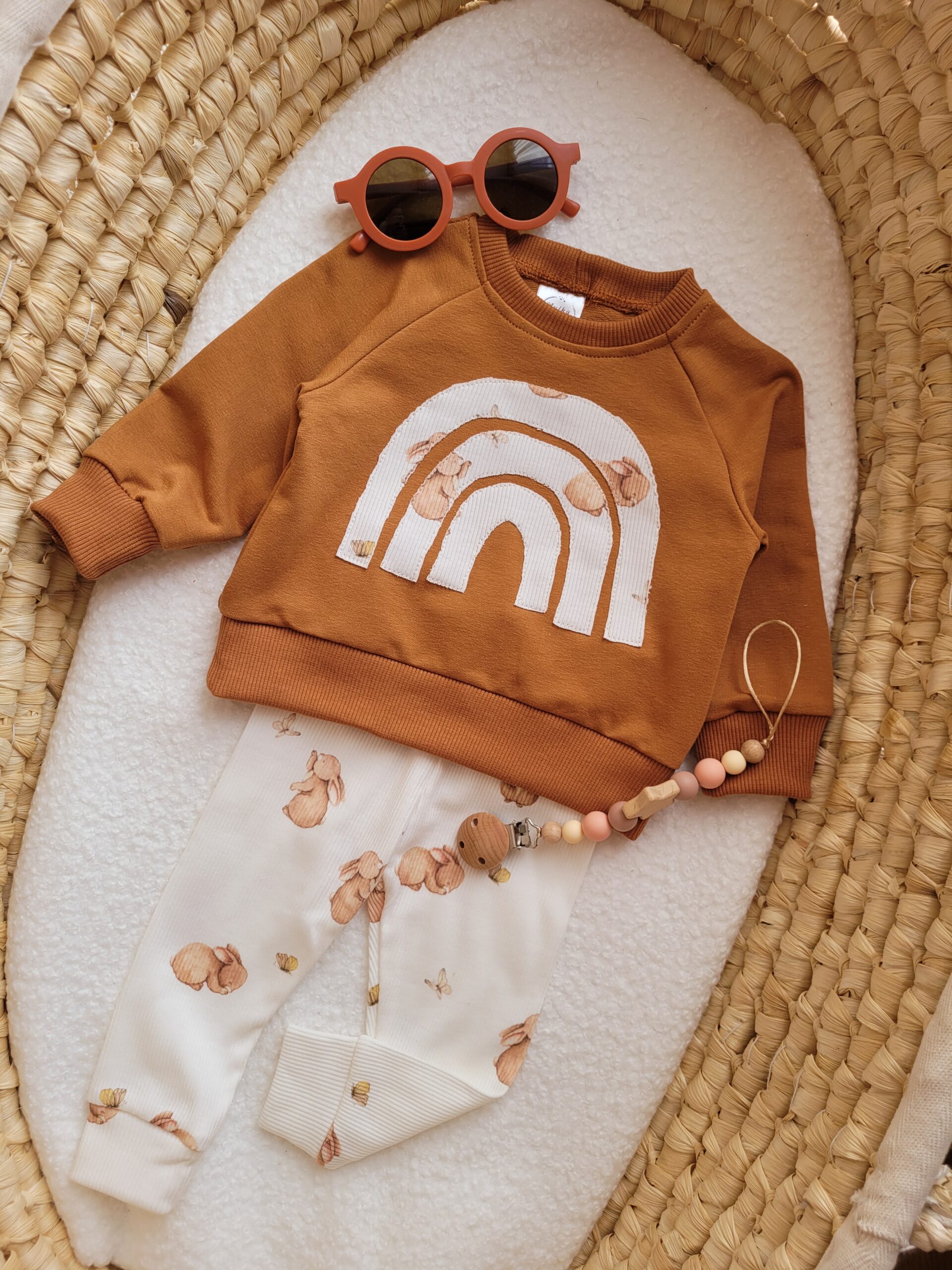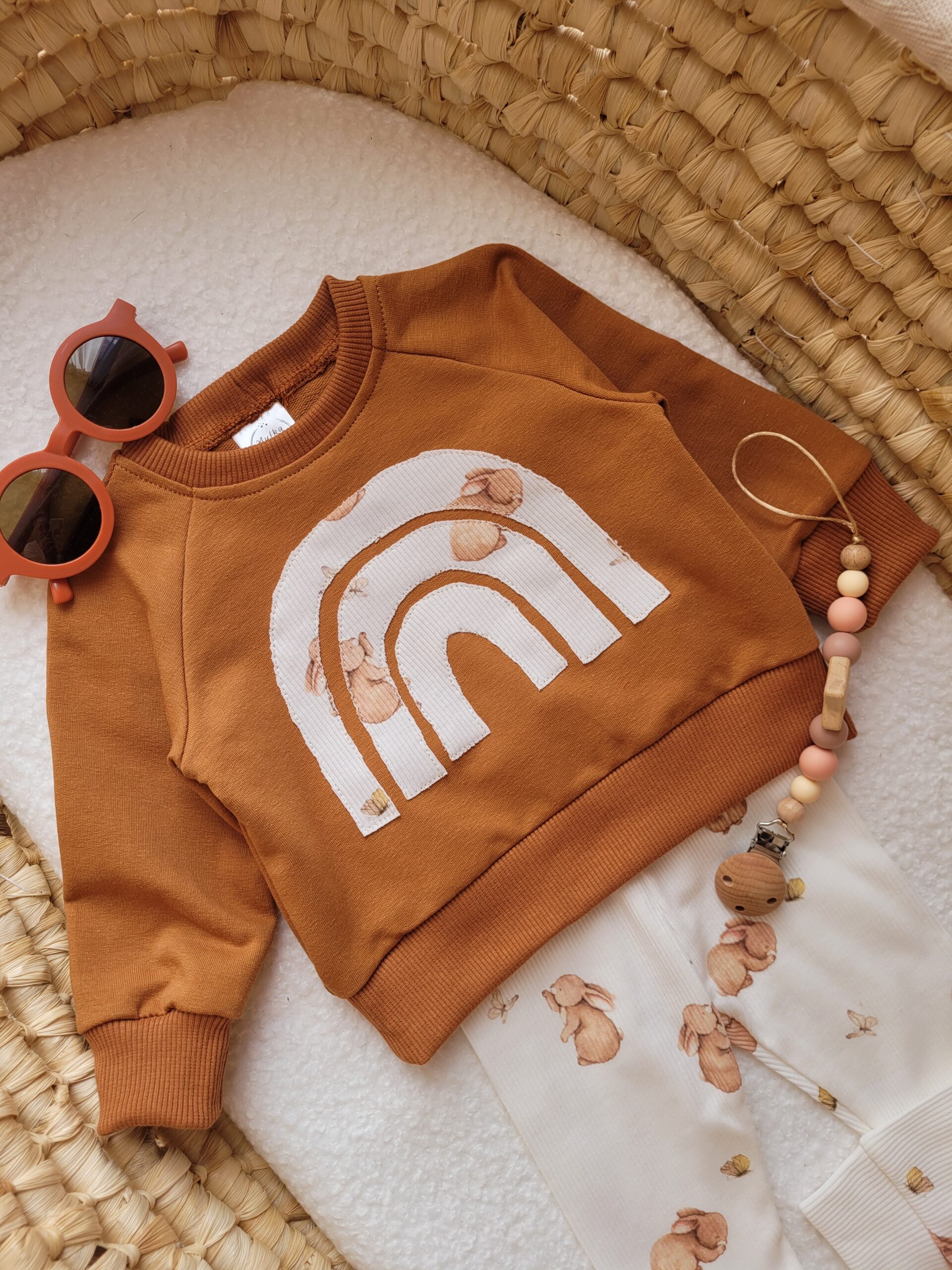 Odkryj naszą wyjątkową bluzę dla dziecka z tęczą, uszytą z najwyższej jakości dzianiny dresowej. Certyfikat Oeko Tex standard 100 gwarantuje pełne bezpieczeństwo dla Twojego malucha. Bluzę szyjemy w kolorze cynamonowym i ozdabiamy uroczą aplikacją w kształcie tęczy. Aplikacja wykonana jest z prążkowanej dzianiny z motywem króliczka, który dodaje jej wyjątkowego uroku. Rozmieszczenie wzorów na tęczy może się różnić w zależności od cięcia materiału.