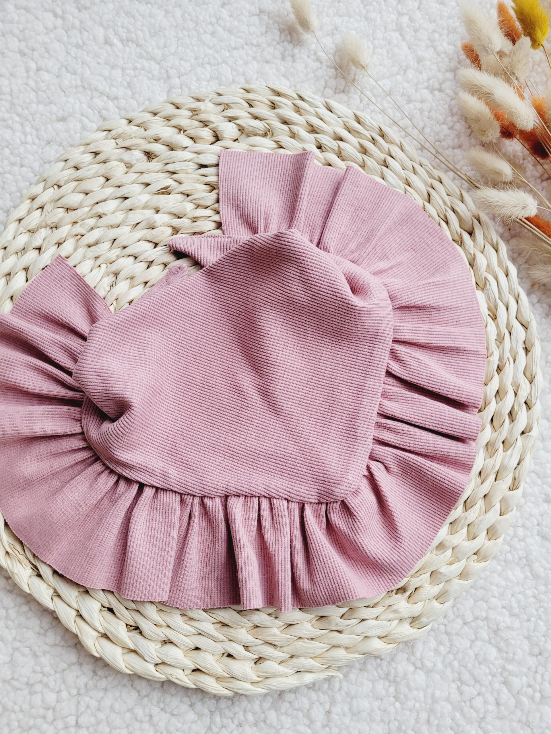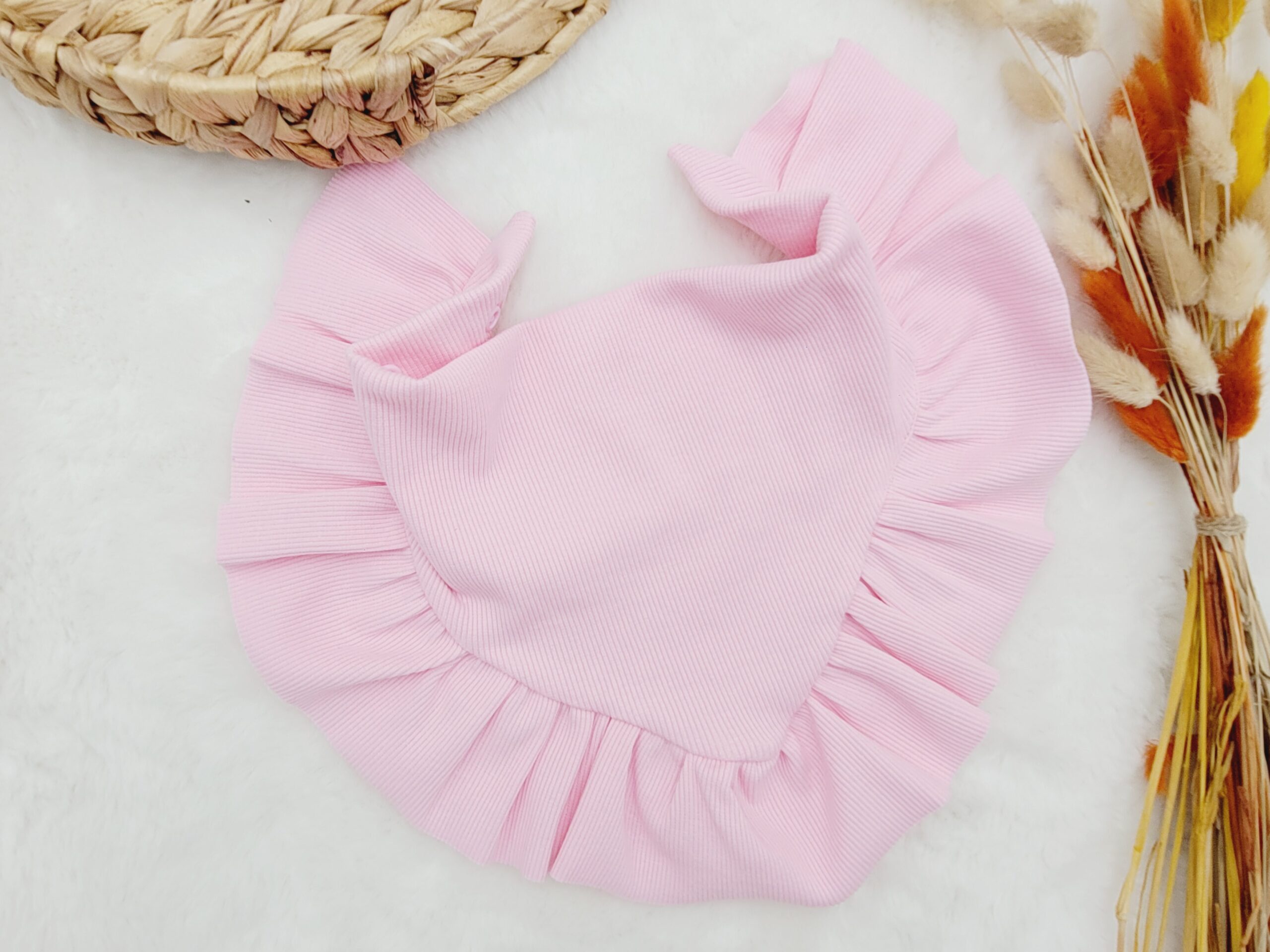 Chusta pod szyję dla dziewczynki z falbanką, szyta z podwójnej dzianiny prążkowanej w wybranym kolorze.
