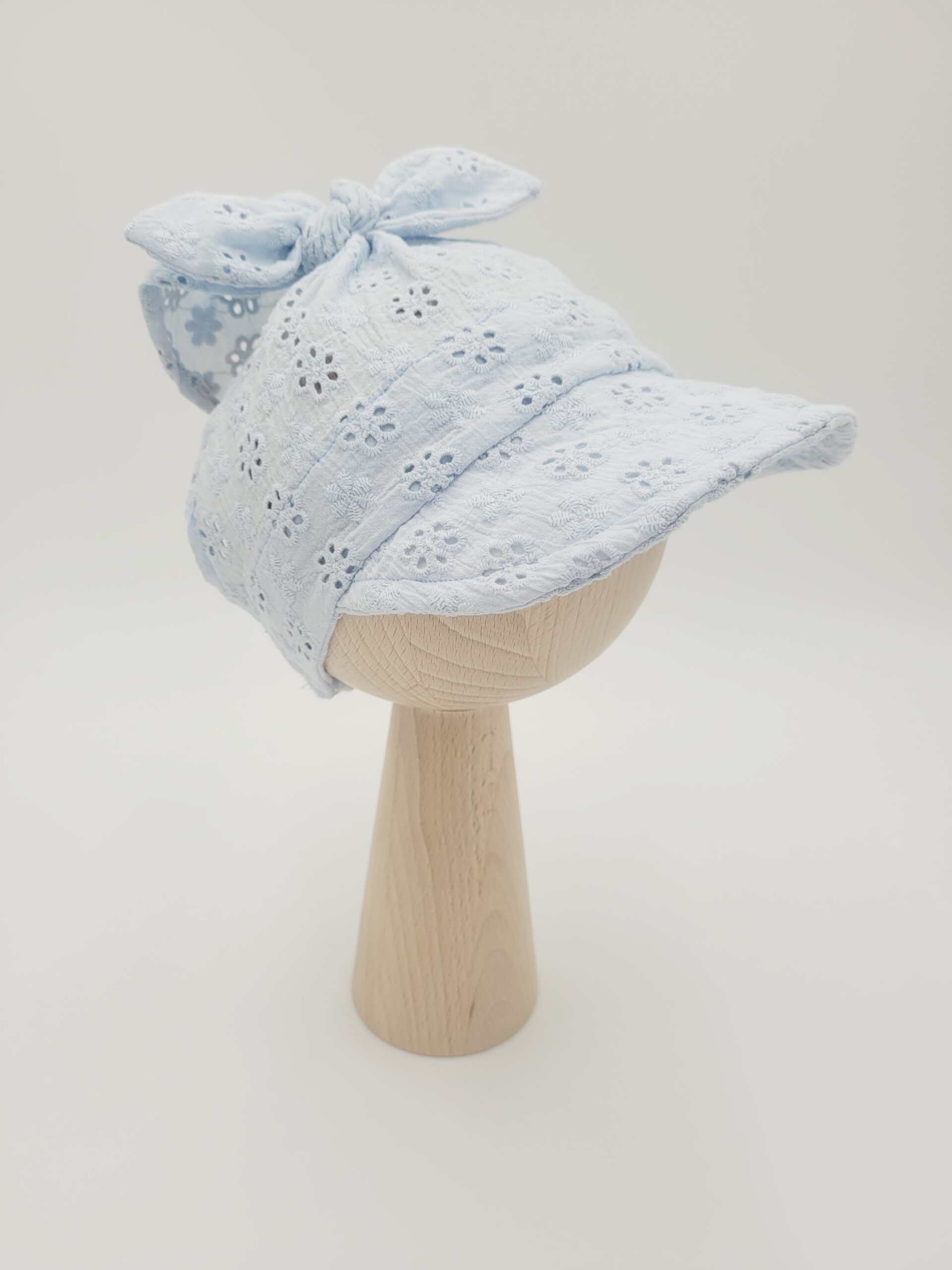 Chustka z daszkiem dla dziewczynki uszyta z wysokiej jakości muślinu bawełnianego z ażurowym haftem w kolorze błękitnym. Dodatkowo przewiązana jest uroczą kokardką, którą możesz regulować wysokość chustki. Rozmiary dla dzieci i niemowląt.