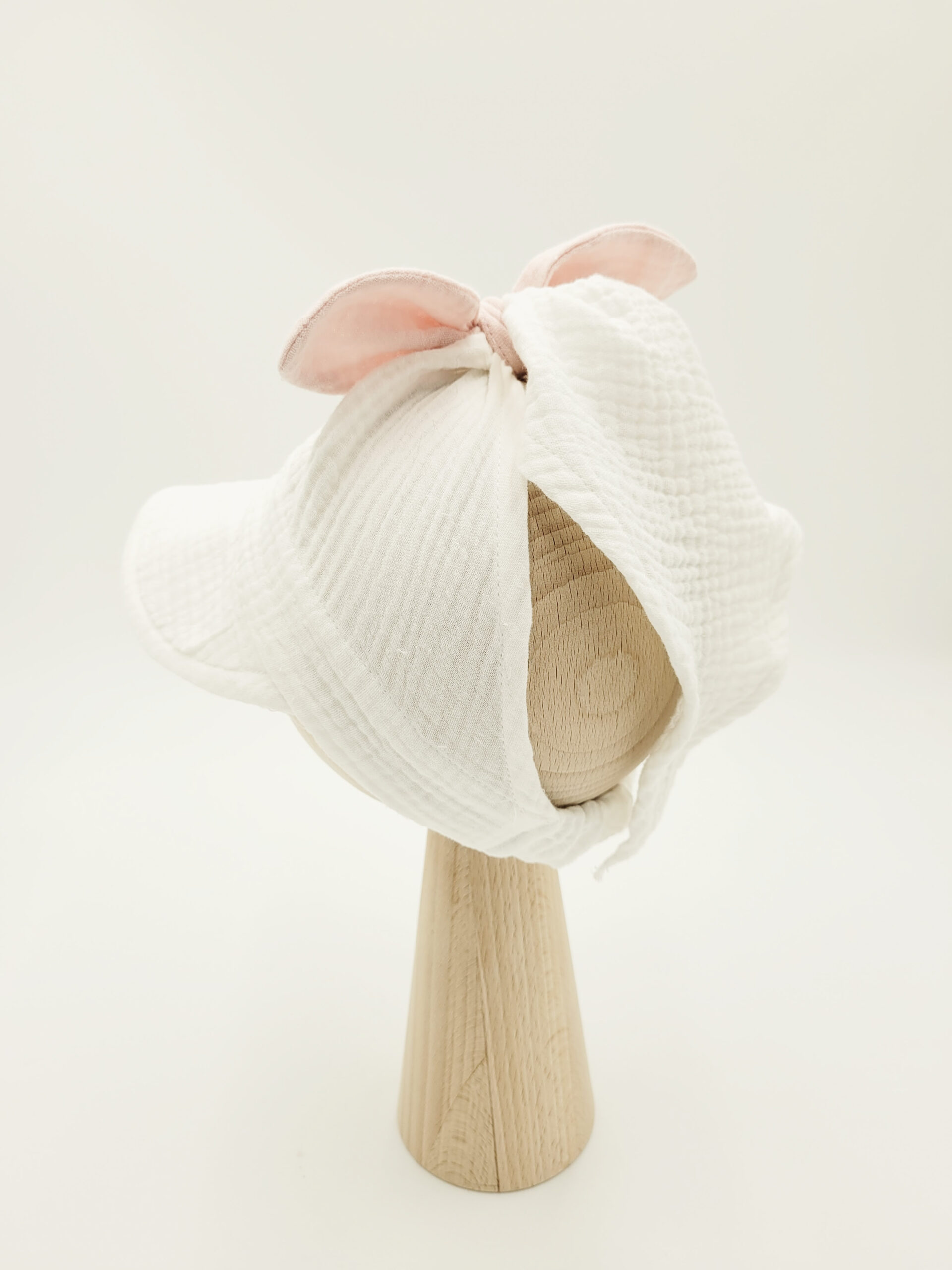 Chustka z daszkiem dla dziewczynki uszyta z wysokiej jakości muślinu bawełnianego lnianego w kolorze ecru. Wysokość chustki można regulować za pomocą kokardki. Rozmiary dla dzieci i niemowląt.