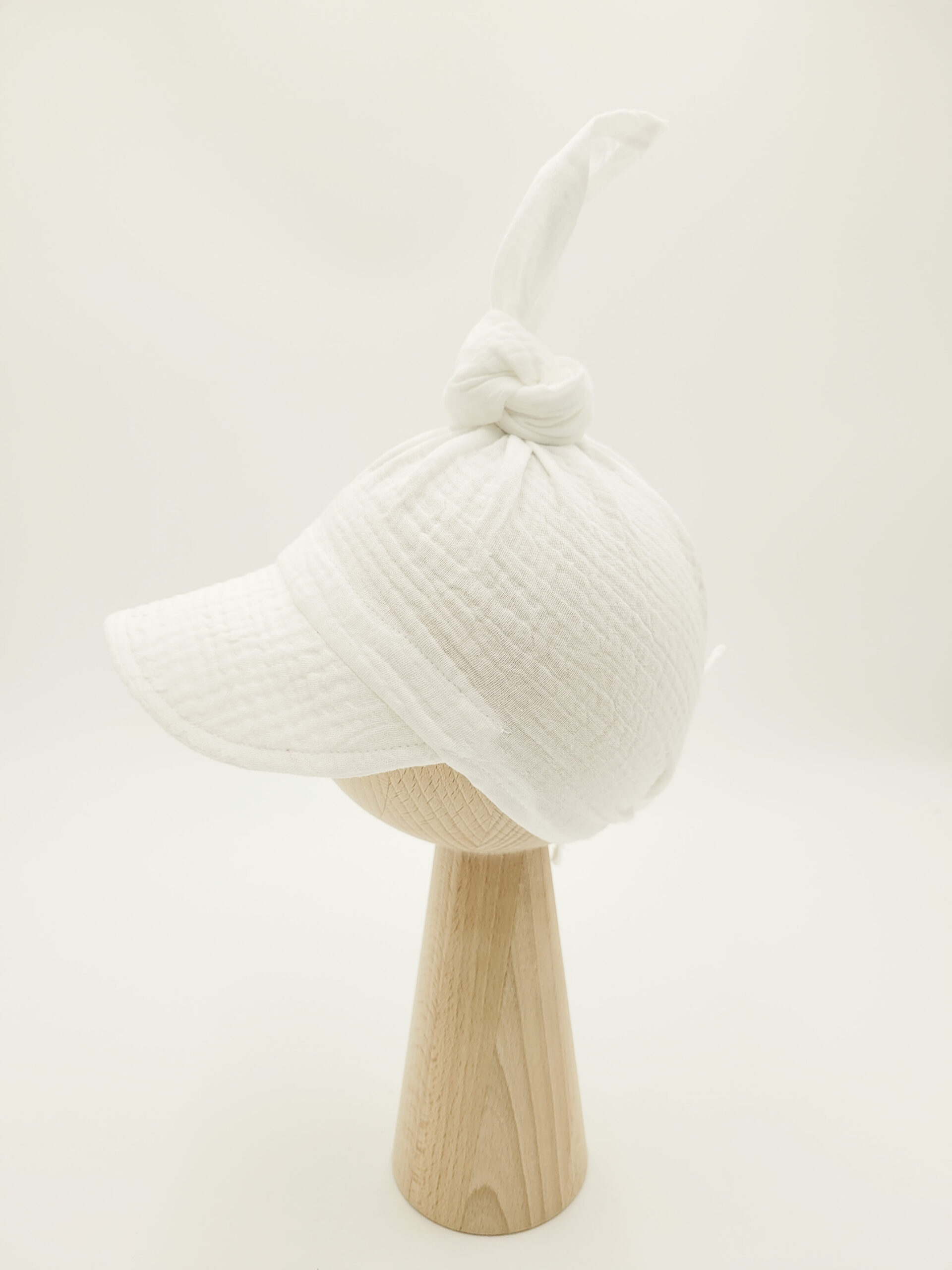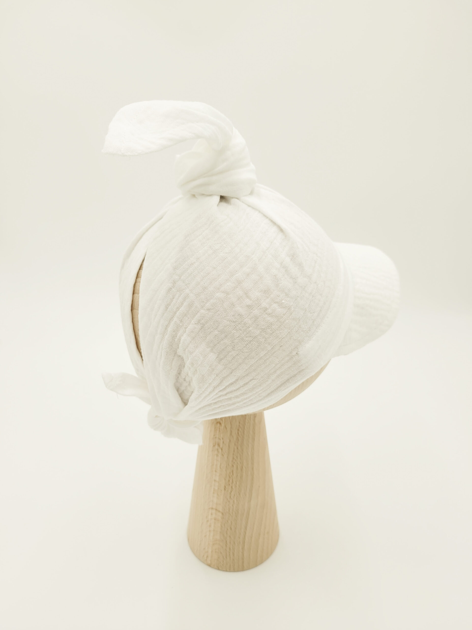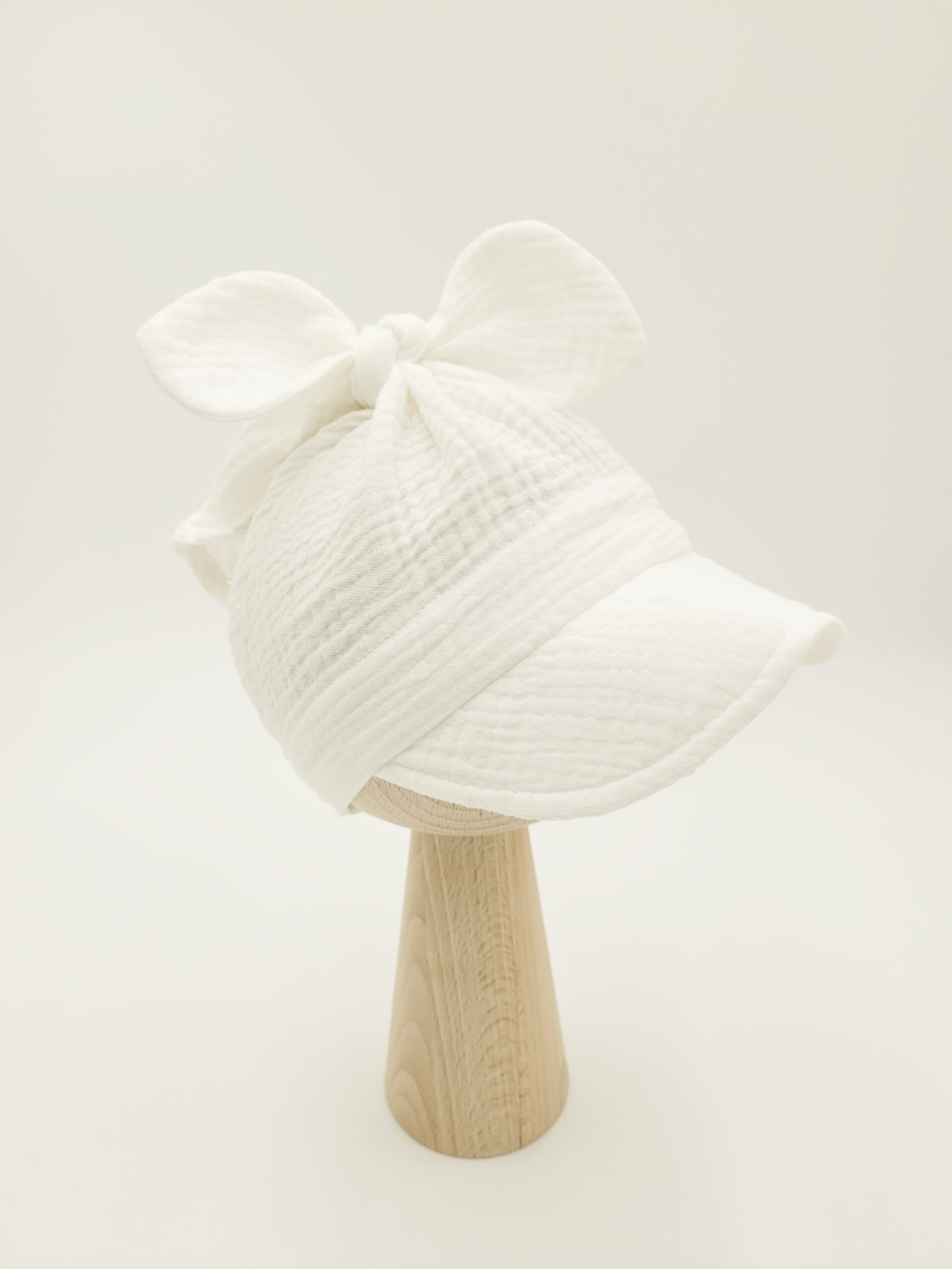 Chusta z daszkiem dla dziewczynki z muślinu bawełnianego w kolorze ecru – wiązana lub na gumce.