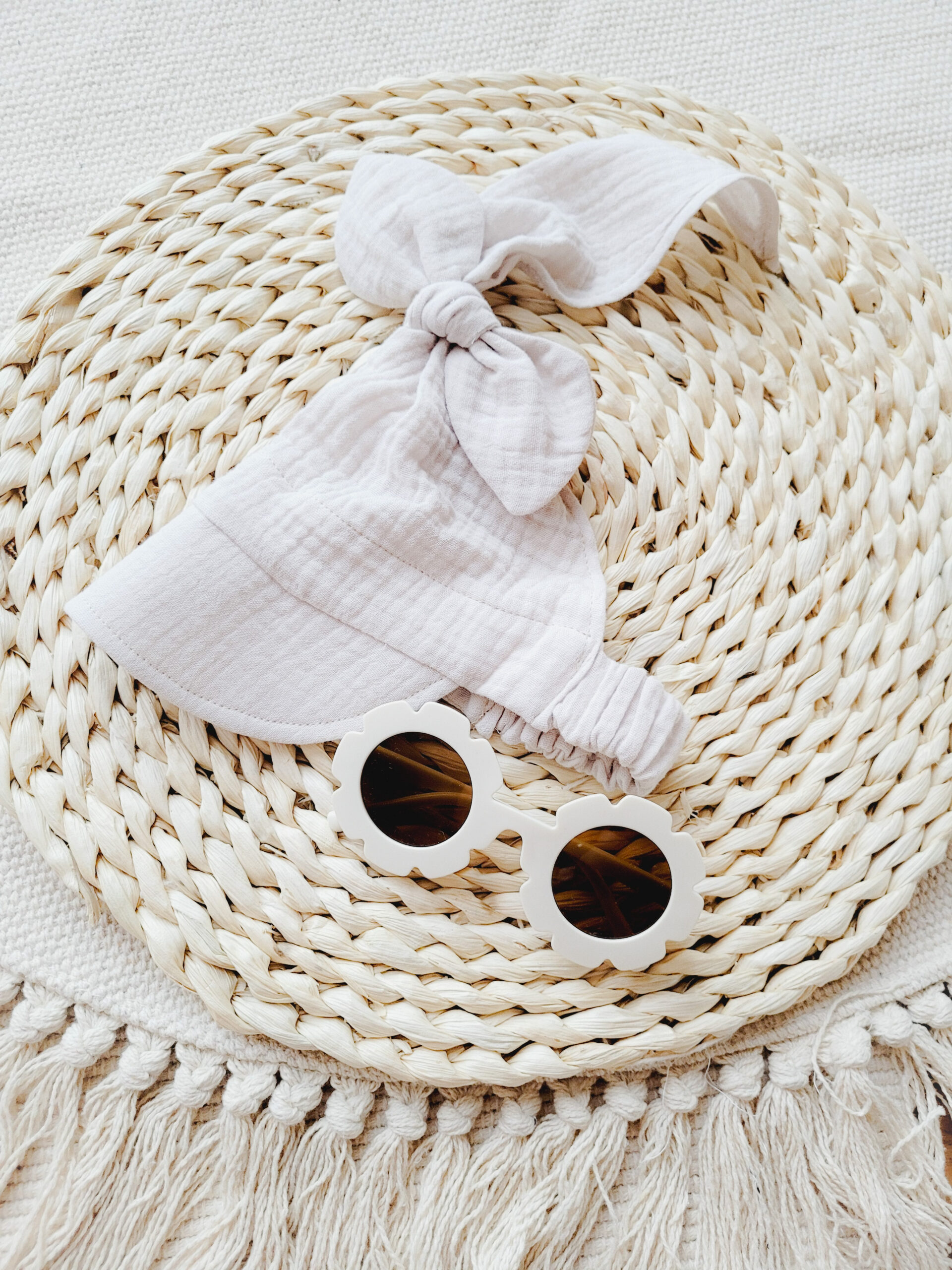 Chusta z daszkiem dziewczynki uszyta z muślinu bawełnianego w kolorze jasny beż- wiązana lub na gumce. Przewiązana kokardką.