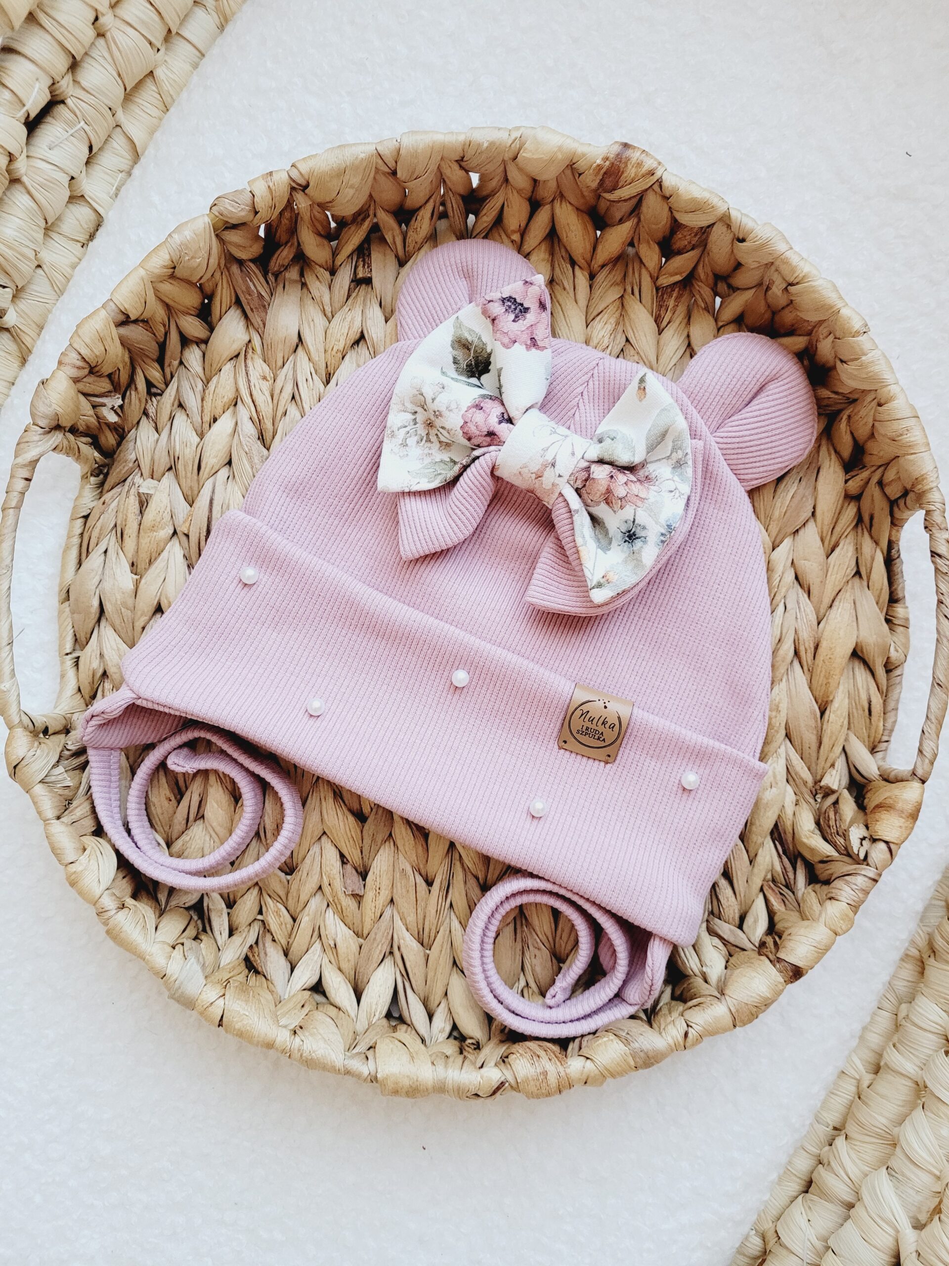 Czapka prążkowana dla dziewczynki ozdobiona misiowymi uszkami i kokardką wzór Purple Garden, piękne perełki na wywinięciu. W wersji zimowej podszyta ciepłym polarem.