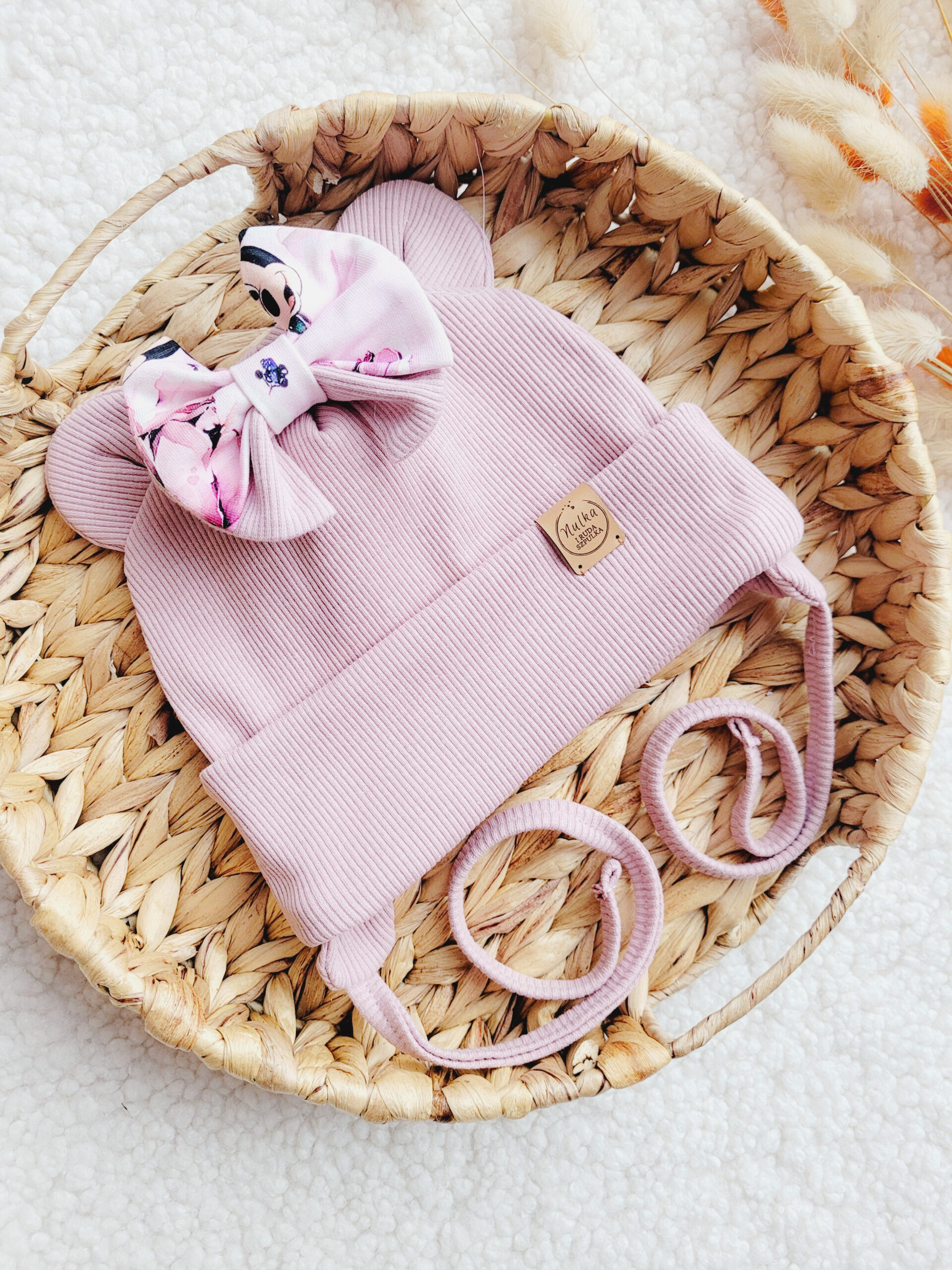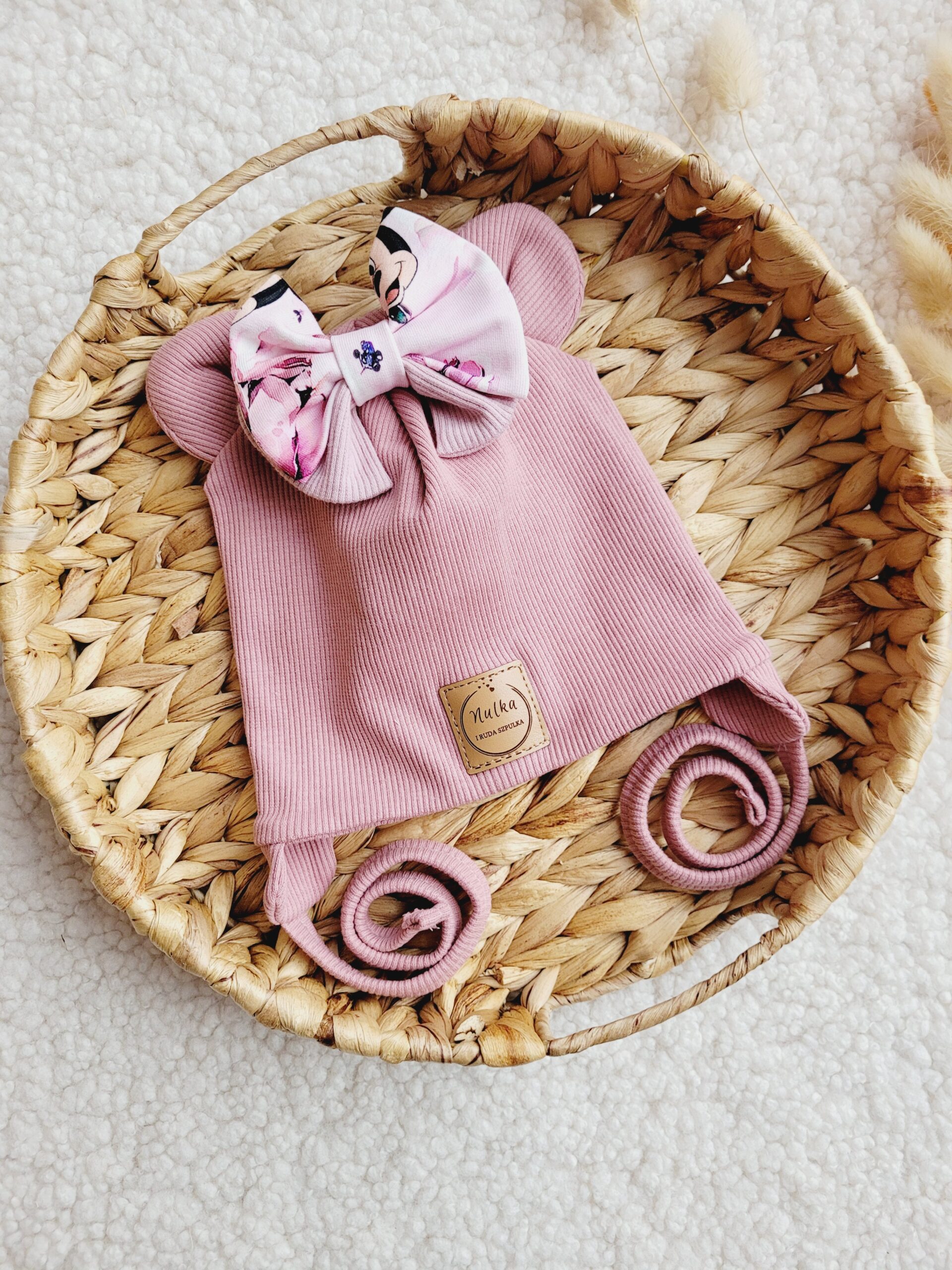 Czapka prążkowana dla dziewczynki ozdobiona misiowymi uszkami i kokardką wzór myszka Minnie i kwiaty z różowym podszyciem. Czapka może być również wiązana i ozdobiona perełkami. W wersji zimowej podszycie ciepłym polarem.