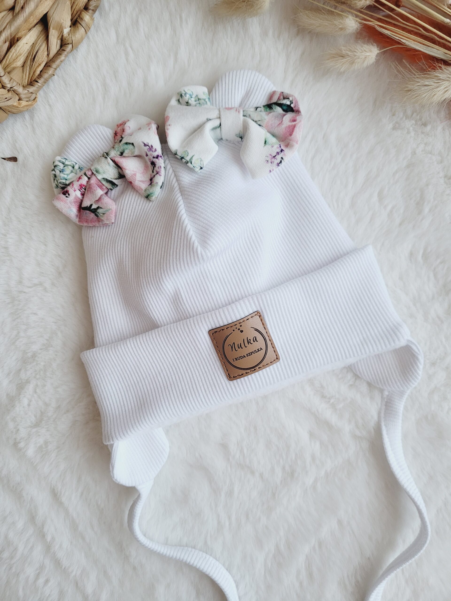 Czapka prążkowana dla dziewczynki ozdobiona misiowymi uszkami i kokardkami wzór Bukiety różane. Dodatkowe perełki i wiązanie.