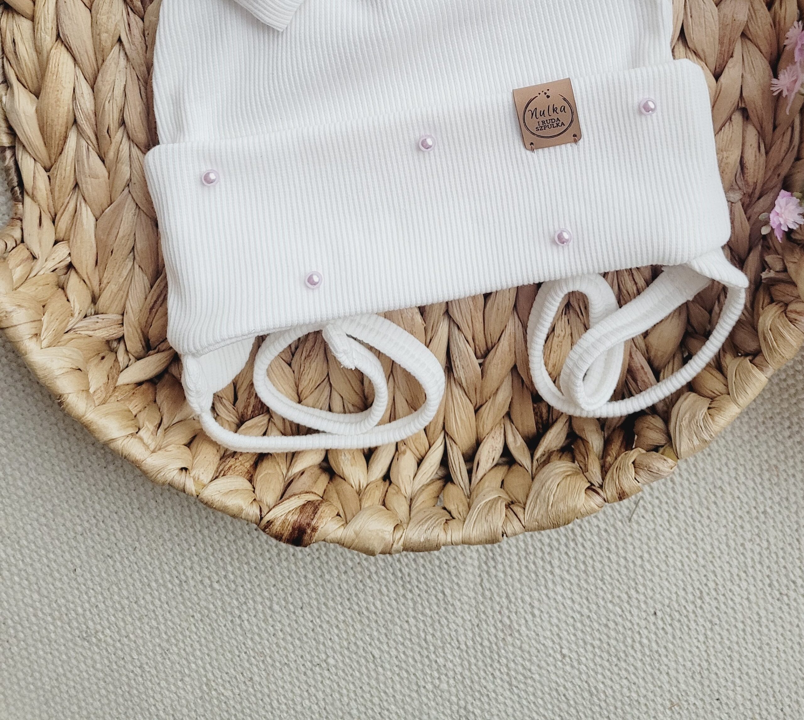A to jeszcze nie wszystko! Specjalnie dla Ciebie możemy ozdobić czapkę pięknymi dodatkami. Jeśli szukasz czegoś jeszcze bardziej funkcjonalnego, wybierz wiązanie z nausznikami lub dodaj śliczne perełki (różowe dla czapki białej i ecru, pozostałe kolory perłowe) na wywinięciu co sprawi, że będzie jeszcze piękniejsza!