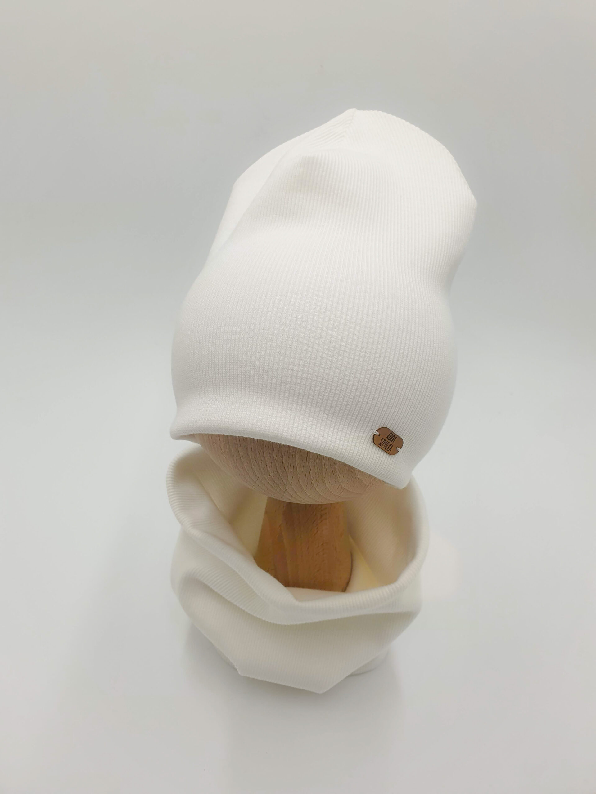 Komplet z dzianiny prążkowanej w kolorze ecru. Prosta lub wywijana czapka połączona z kominem do wyboru.