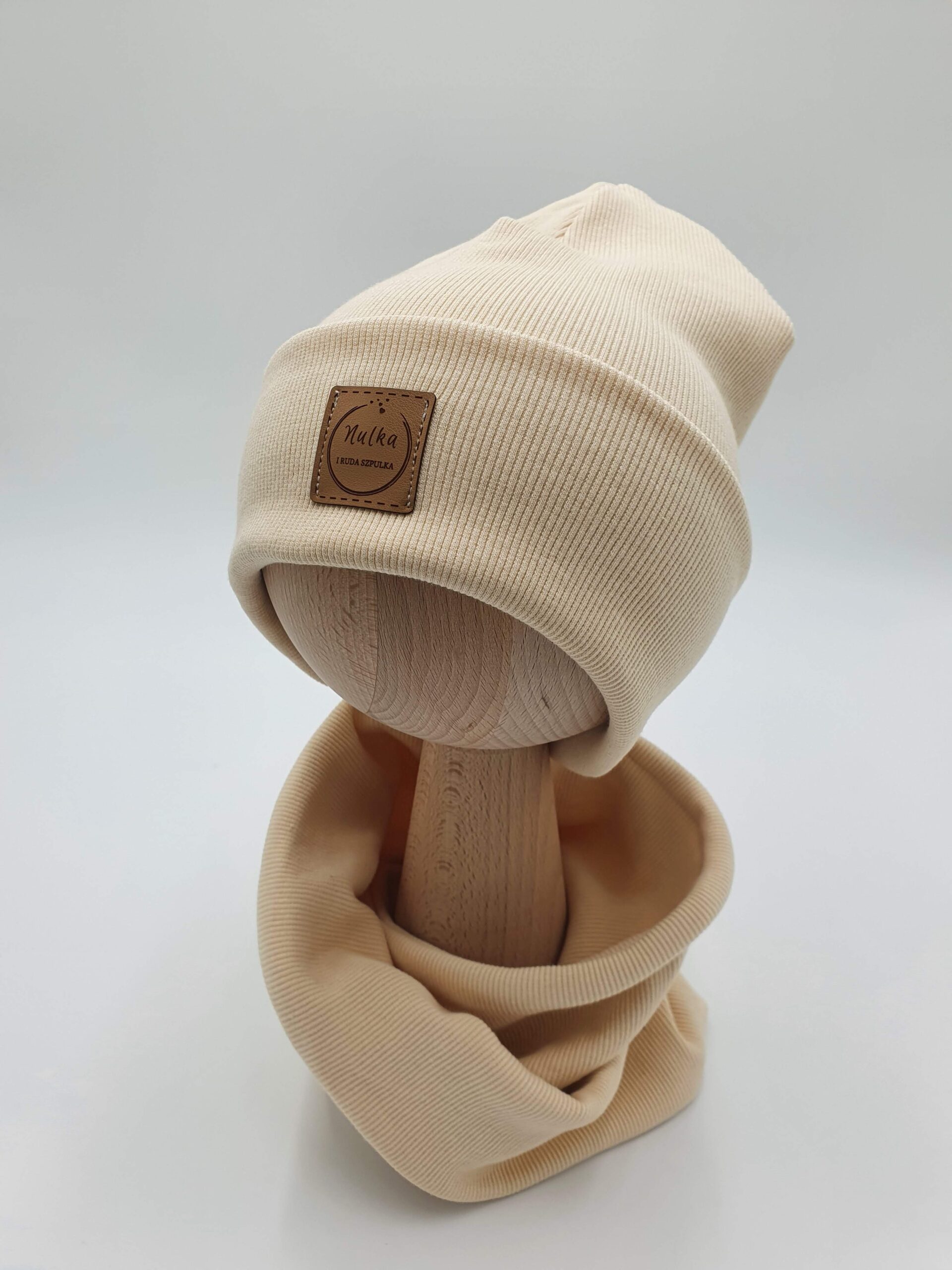 Komplet z dzianiny prążkowanej w kolorze kremowym. Prosta lub wywijana czapka połączona z kominem do wyboru.