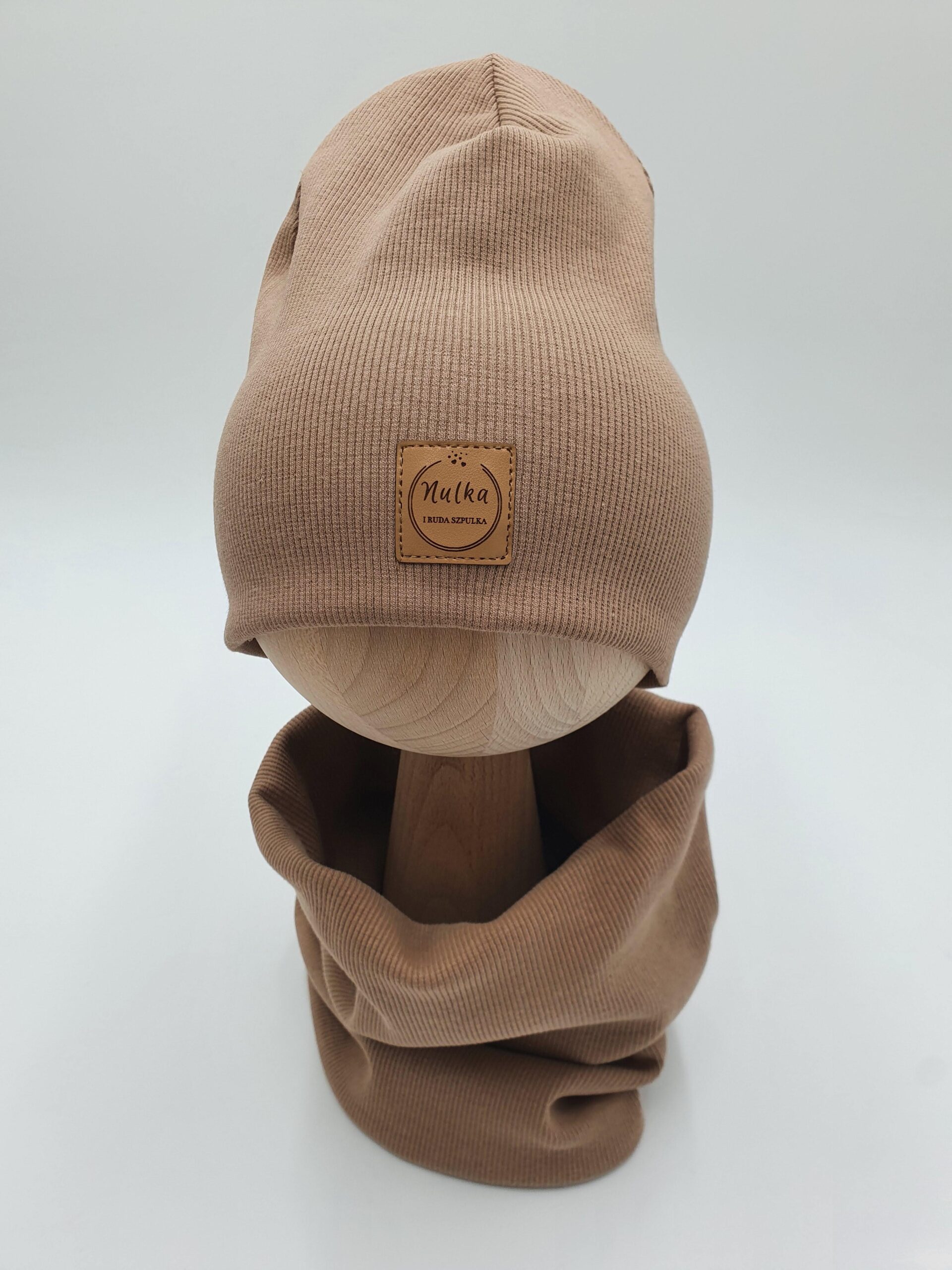 Czapka ozdobiona jest naszywką z logo Nulka i Ruda Szpulka, dodając wyjątkowego uroku. Dzianina prążkowana posiada certyfikat Oeko-Tex Standard 100, co oznacza, że jest bezpieczna dla delikatnej skóry dziecka.