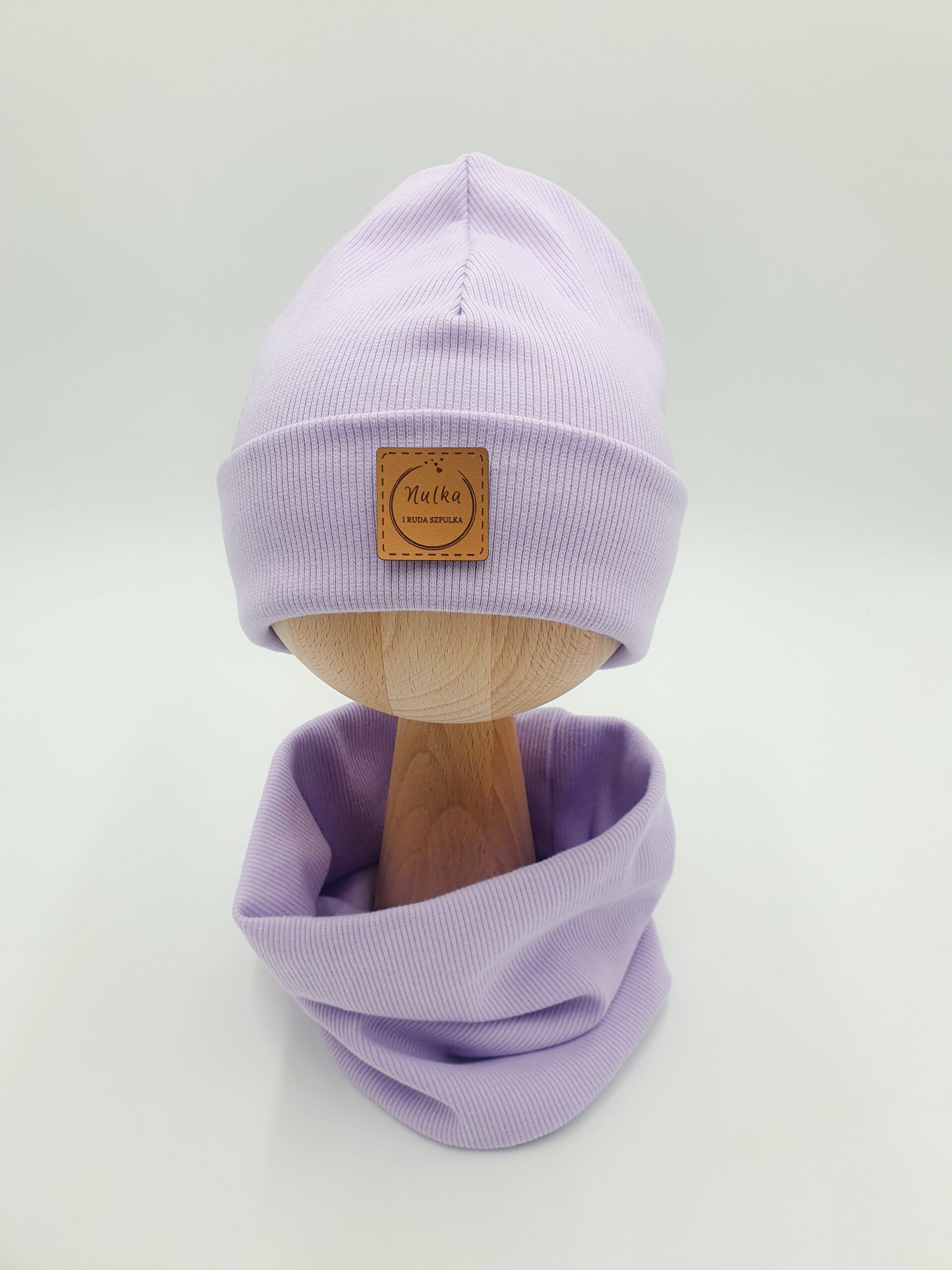 Komplet z dzianiny prążkowanej w kolorze lawendowym. Prosta lub wywijana czapka połączona z kominem do wyboru.