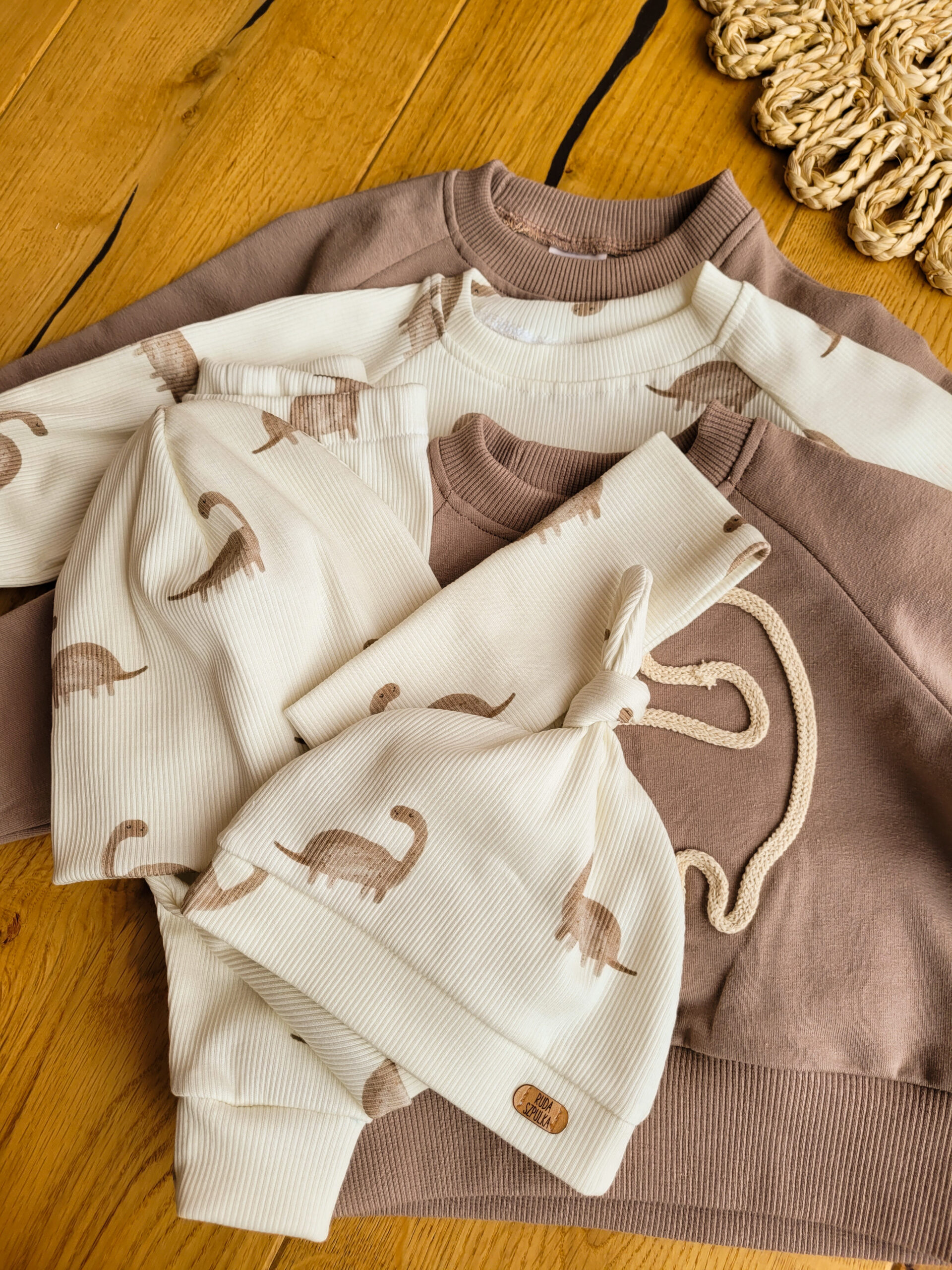 Niemowlęca czapka z supełkiem z dzianiny prążkowanej premium z dinozaurami.
