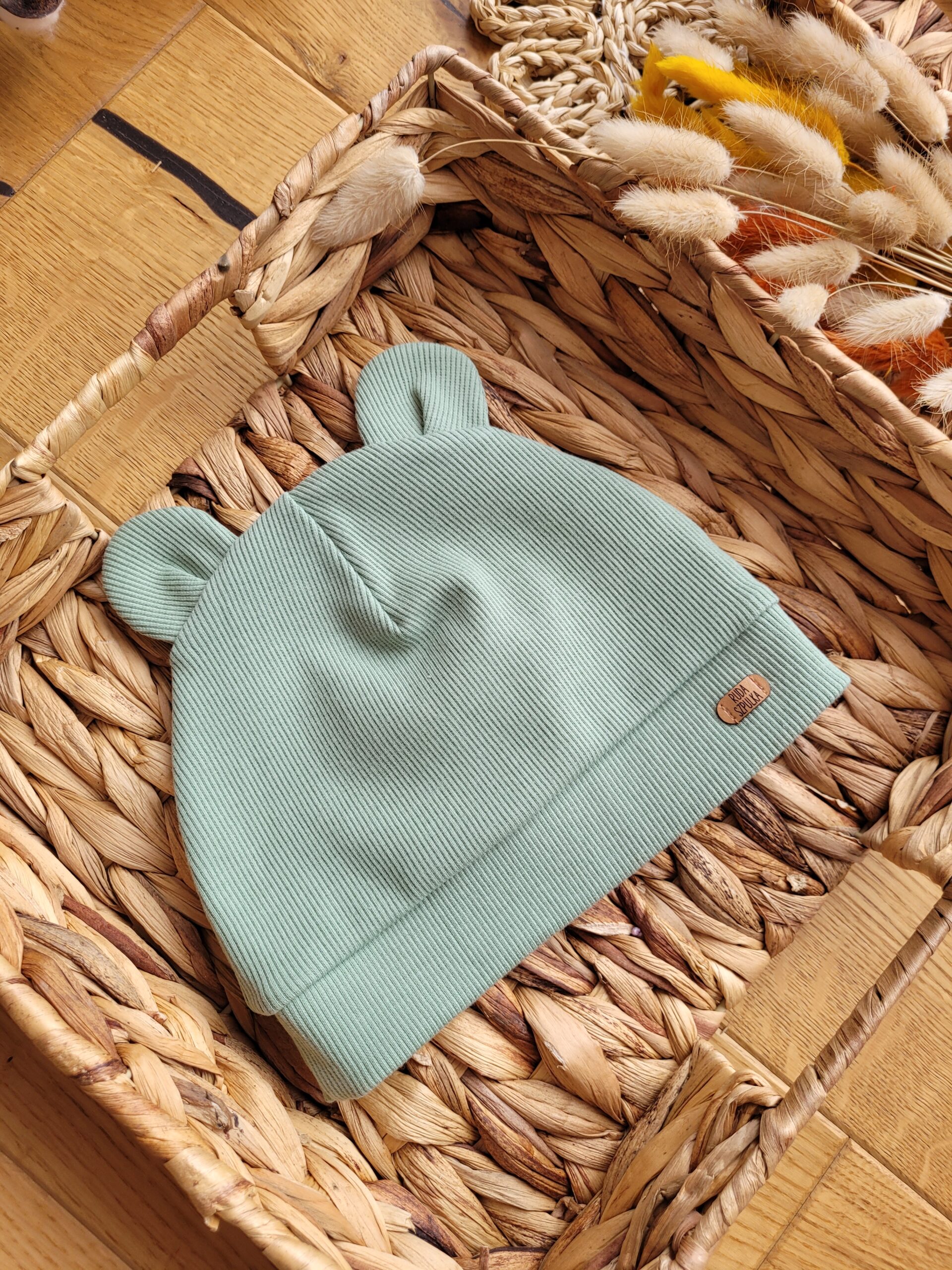 Niemowlęca czapka z dzianiny prążkowanej z misiowymi uszkami w wybranym kolorze. Rozmiary 34-46.