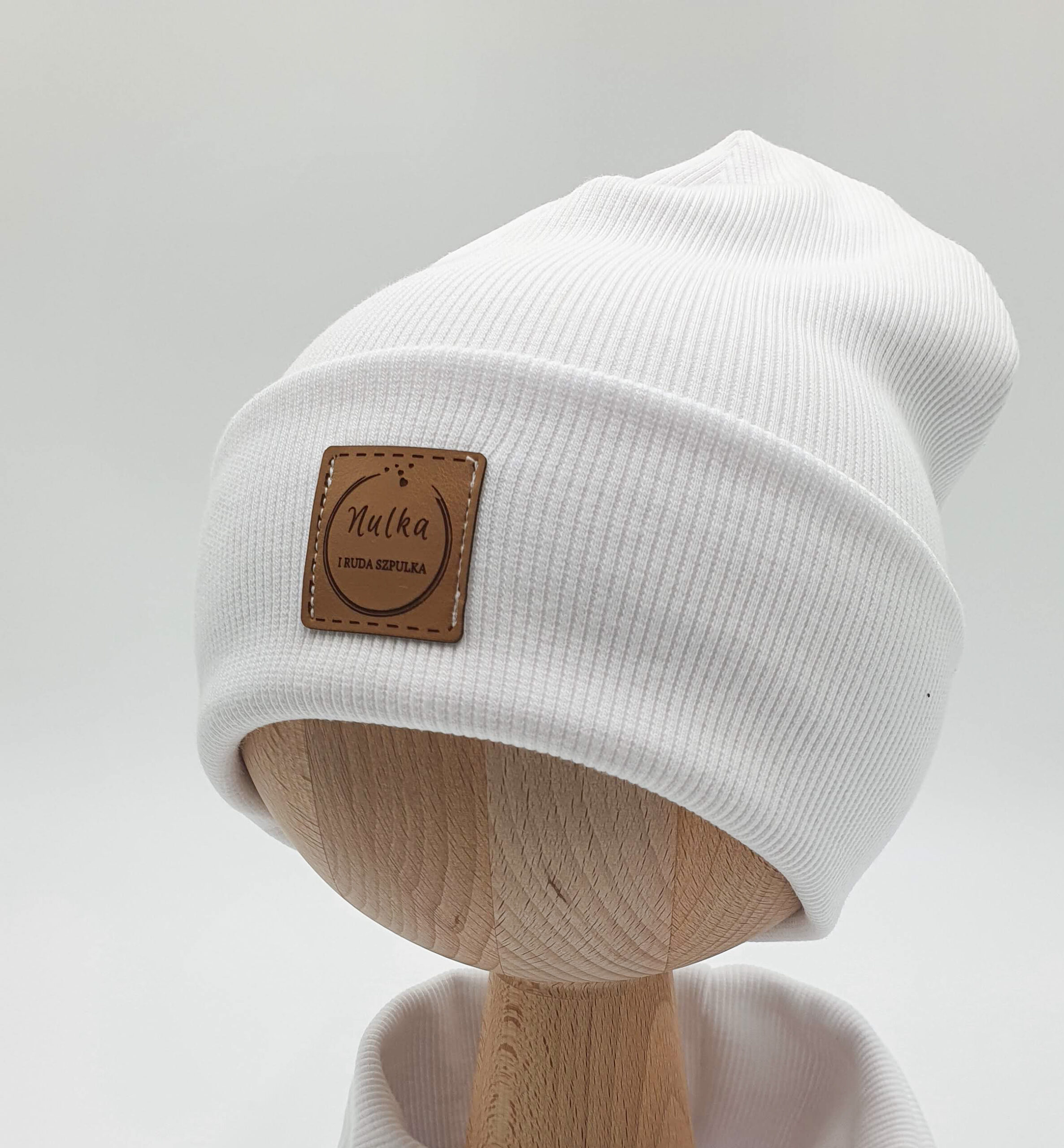 Czapka prosta lub wywijana z dzianiny prążkowanej w kolorze białym.