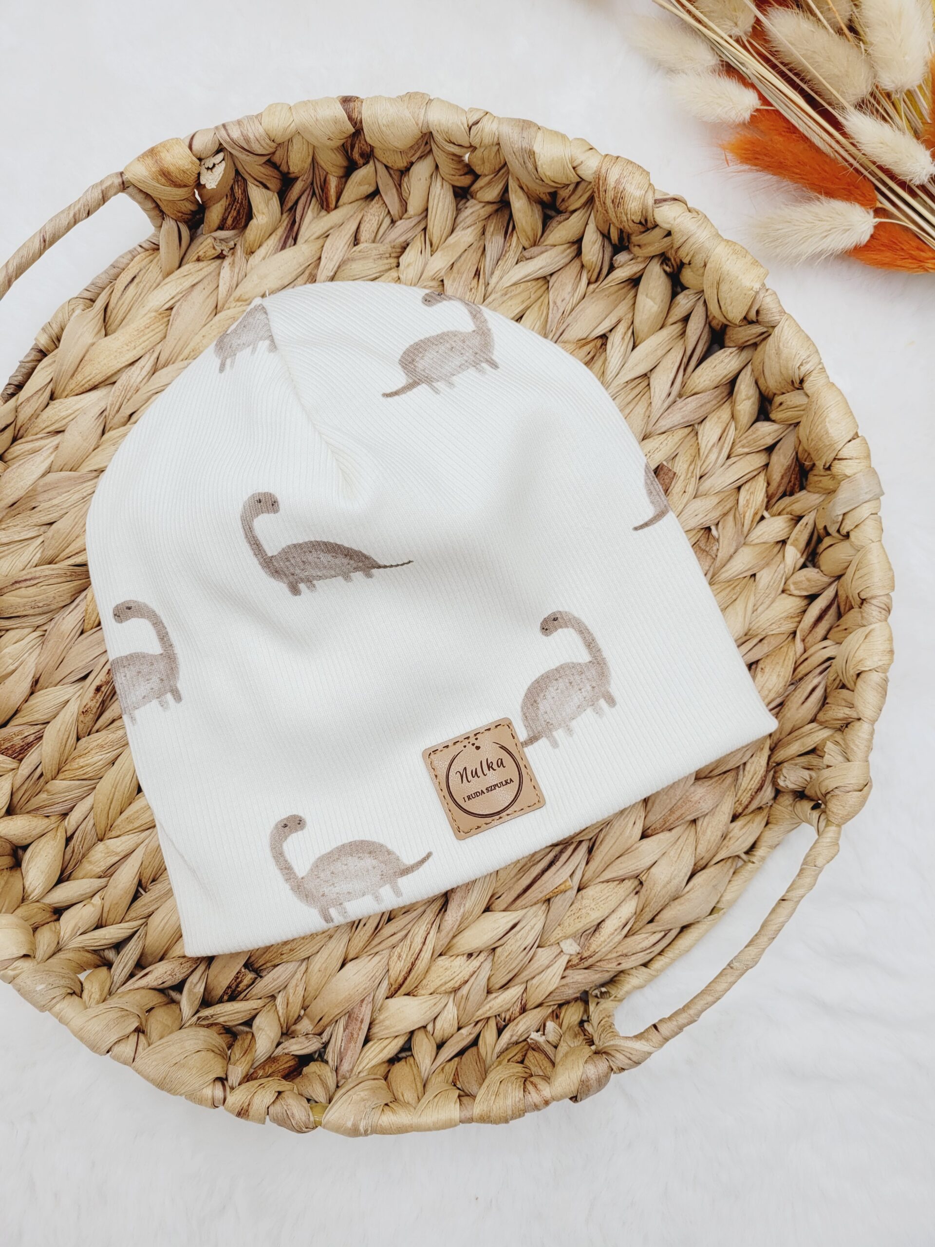 Dziecięca czapka z dzianiny prążkowanej wzór dinozaury.