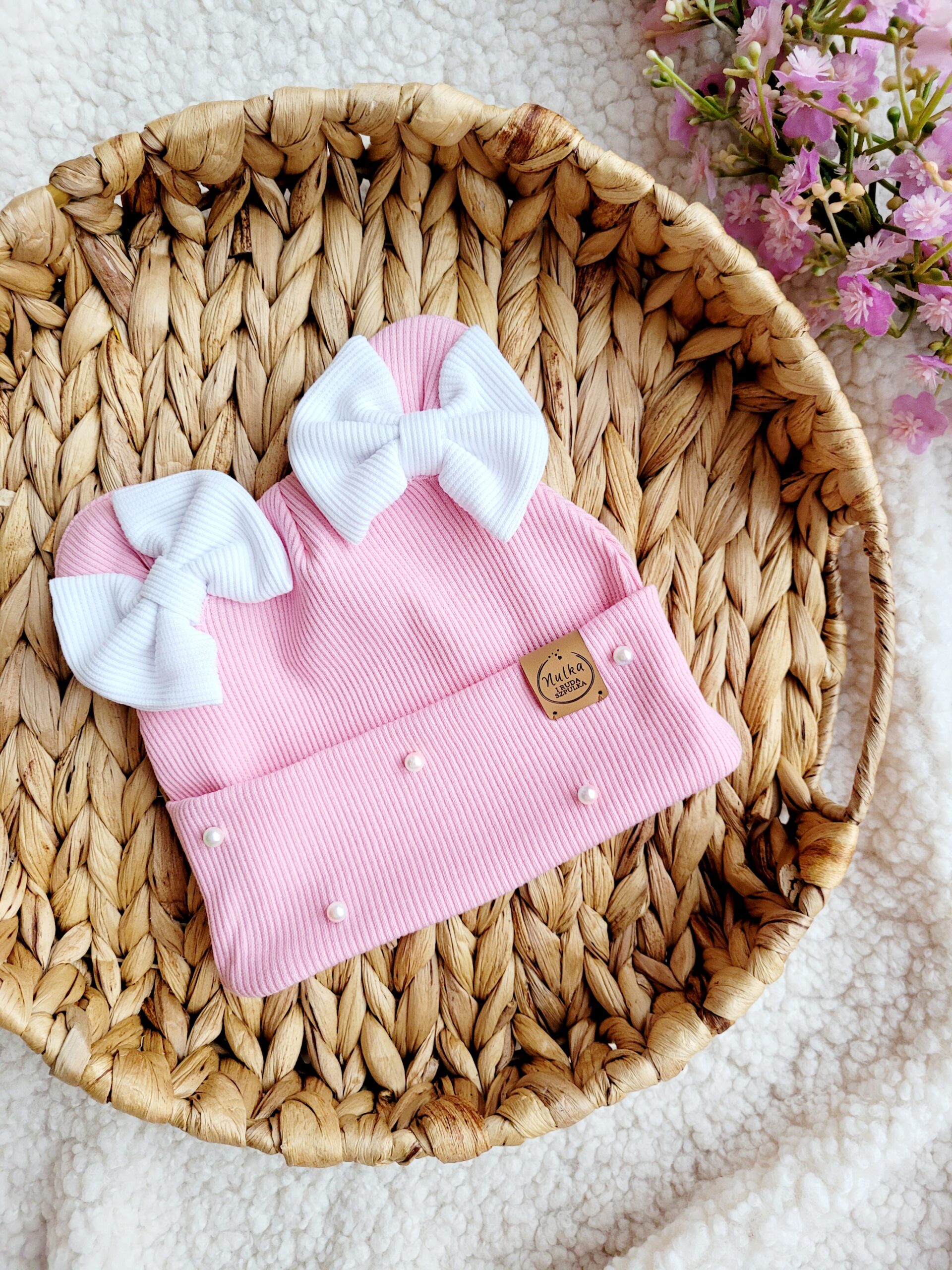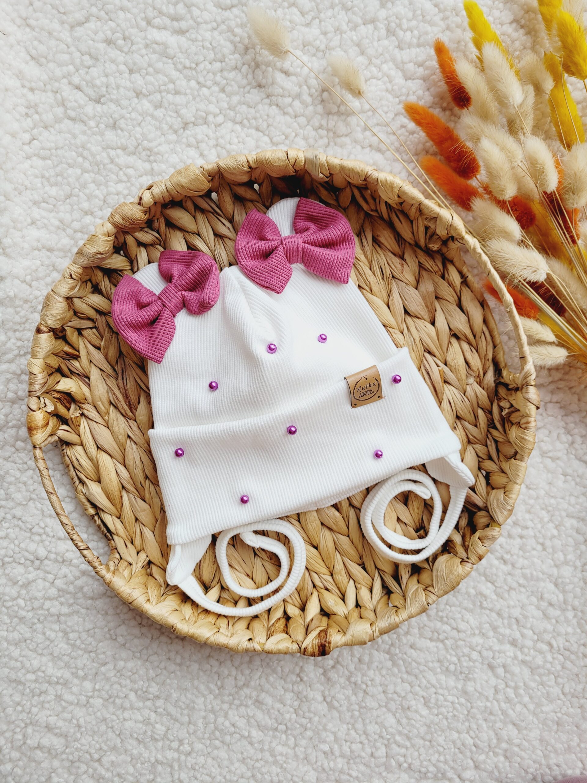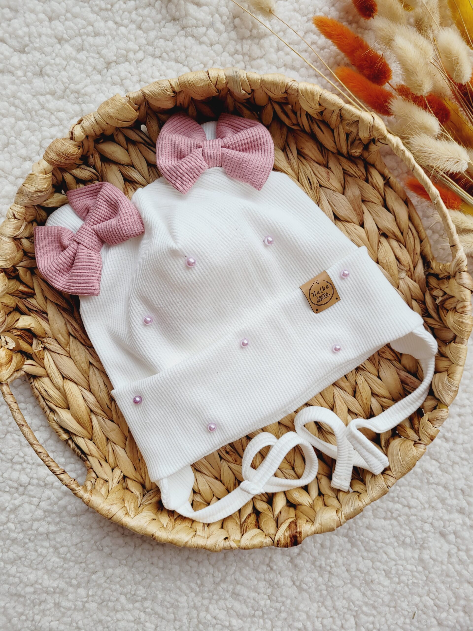 1 opinia dla Czapka prążkowana dla dziewczynki z kokardkami i perełkami – kolory do wyboru
