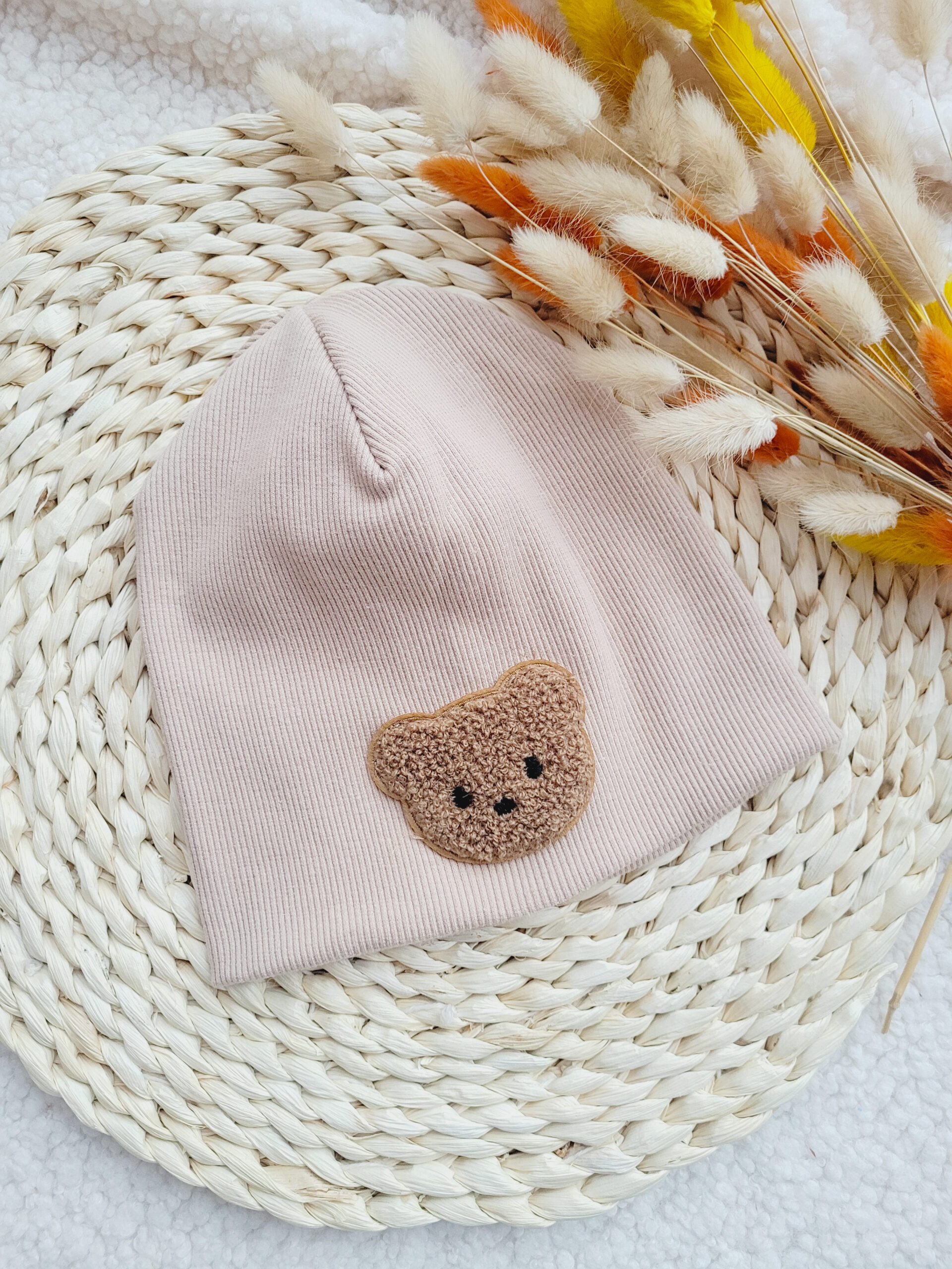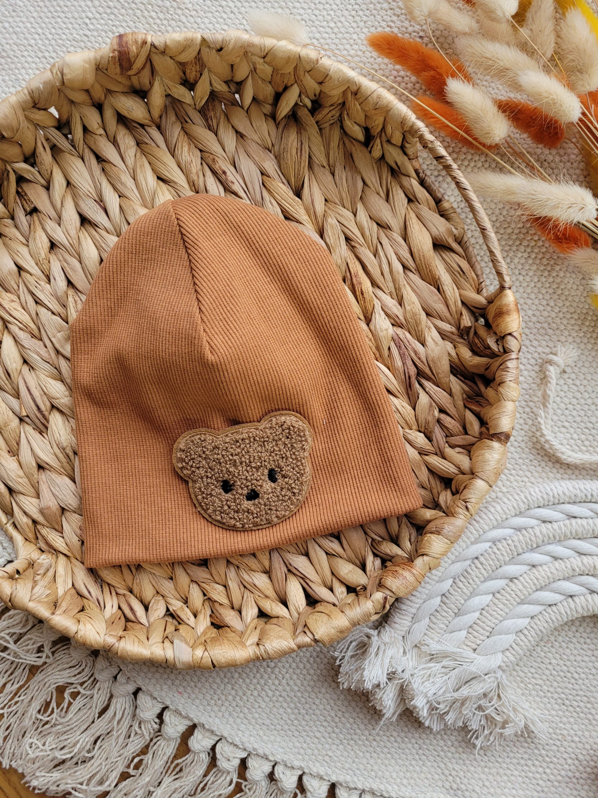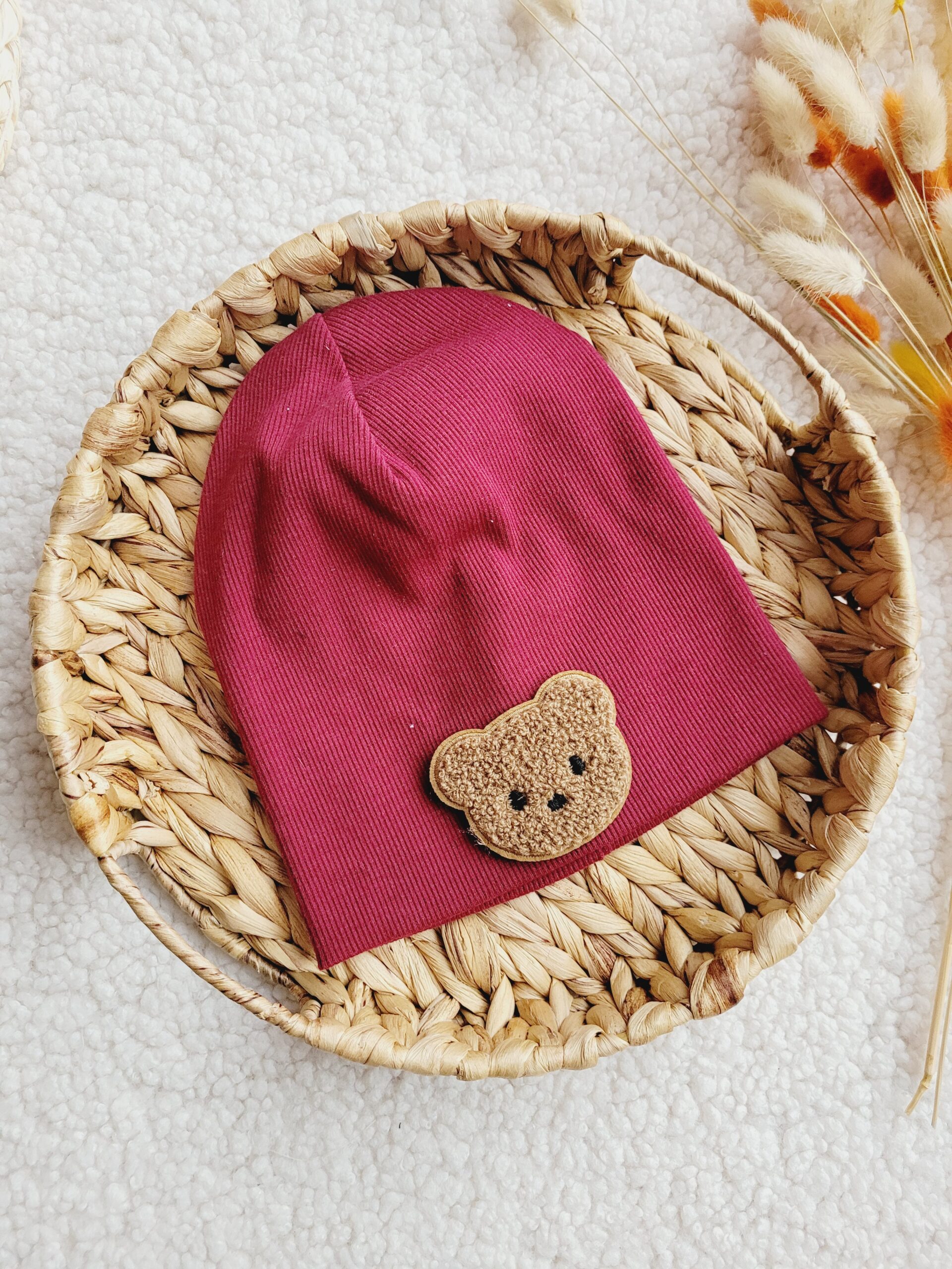 Czapka prążkowana dla chłopca lub dziewczynki w wybranym kolorze ozdobiona naszywką z misiem.