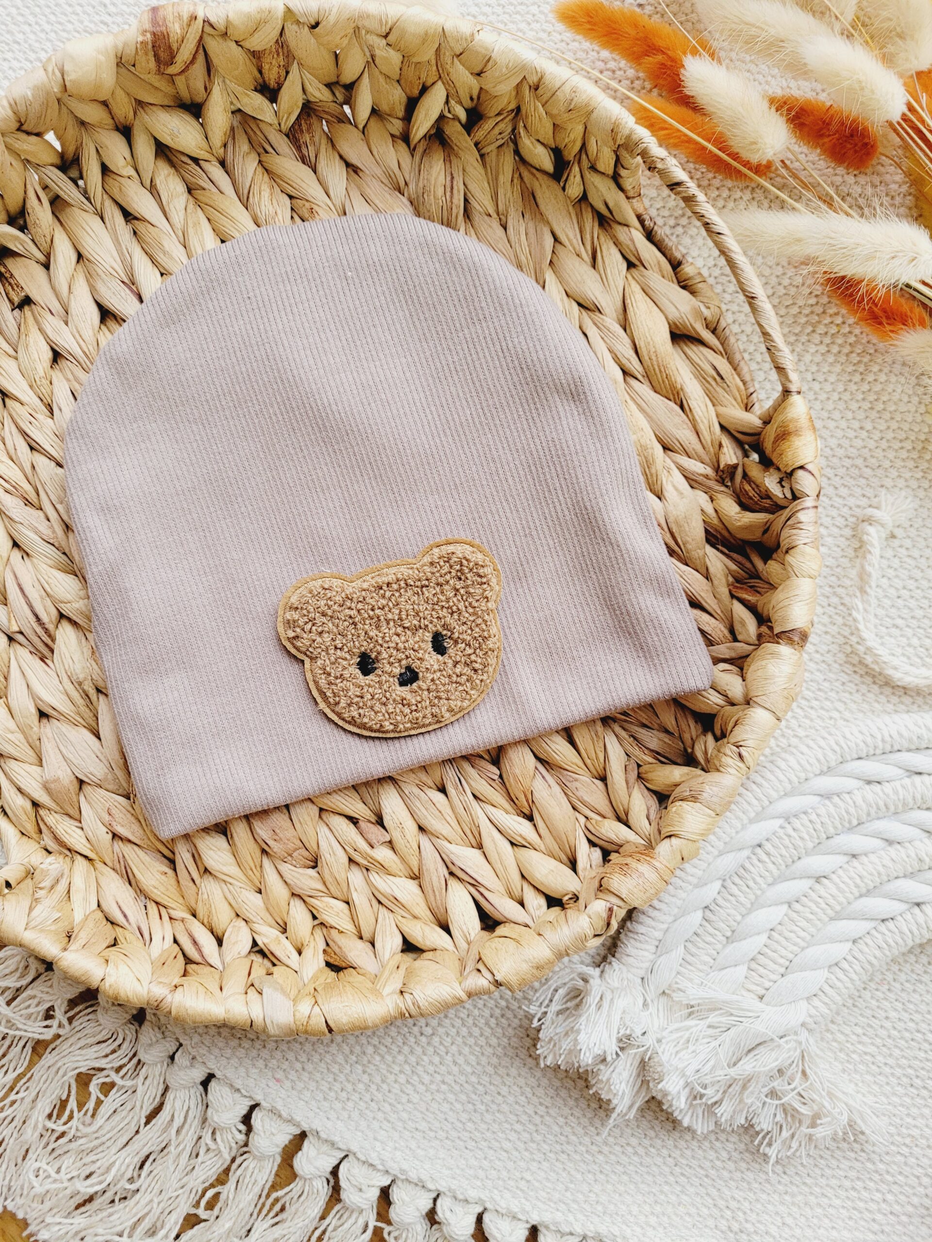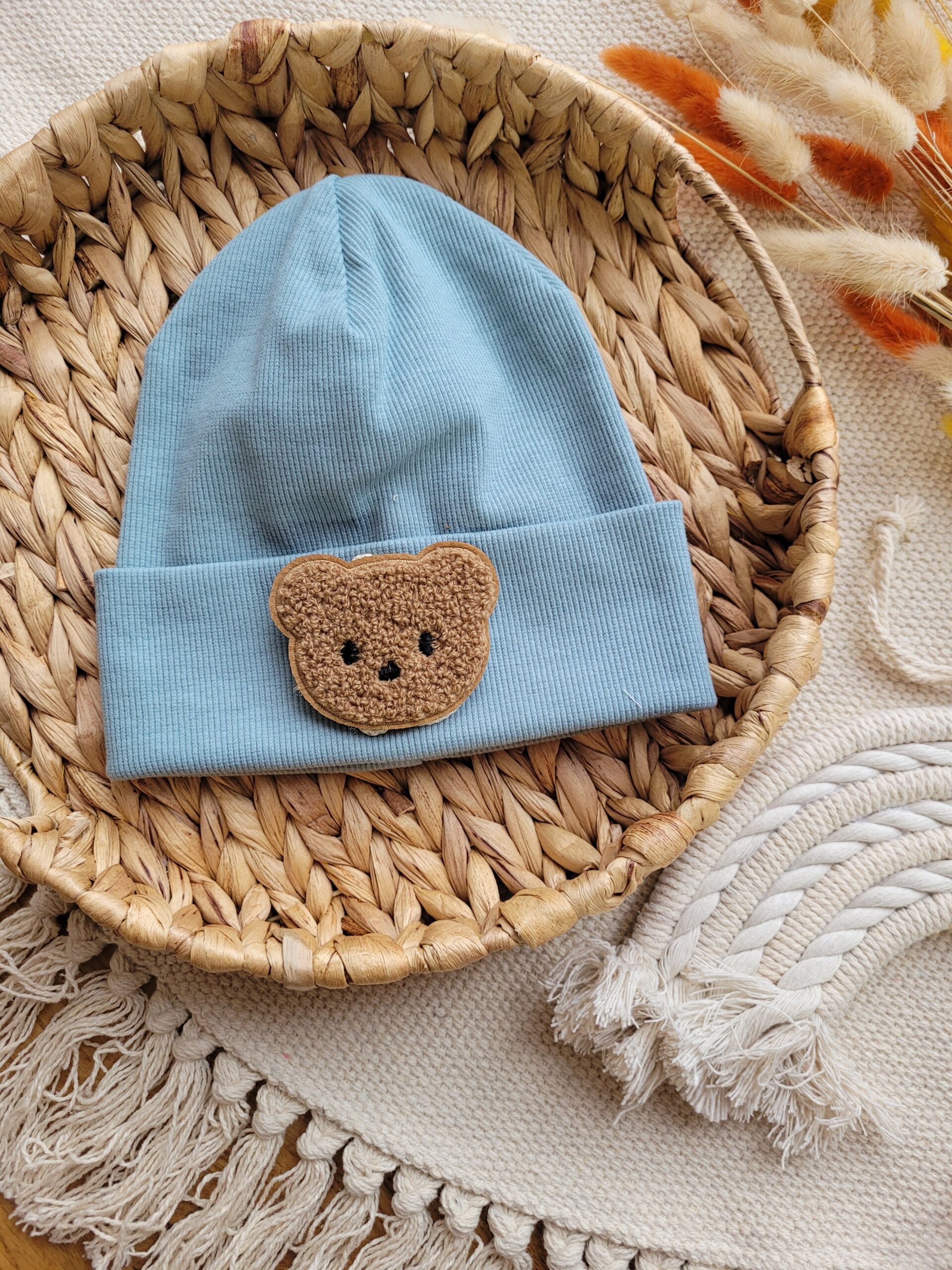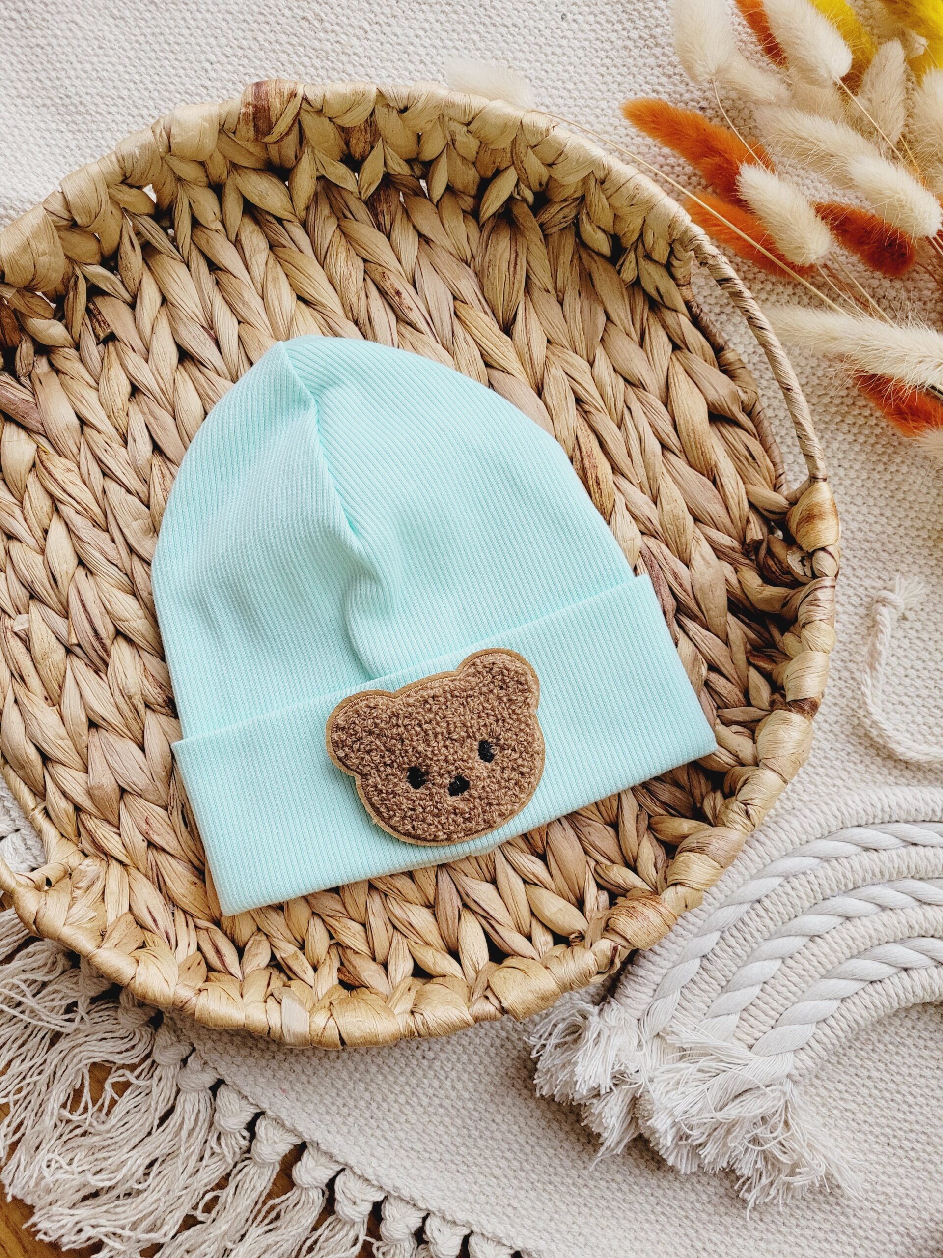 Czapka prążkowana dla chłopca lub dziewczynki w wybranym kolorze ozdobiona naszywką z misiem.