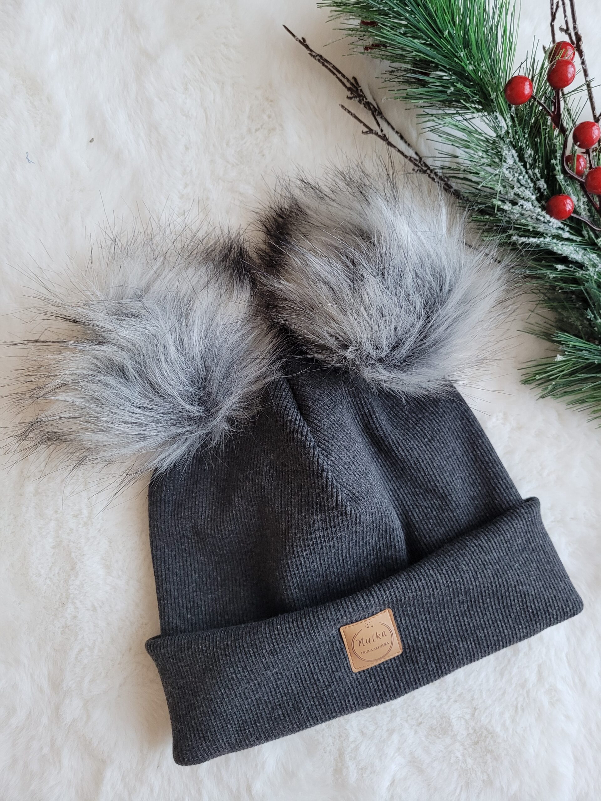 Czapka prążkowana w kolorze antracytowym z jednym lub dwoma pomponami. Możliwość podszycia polarem.