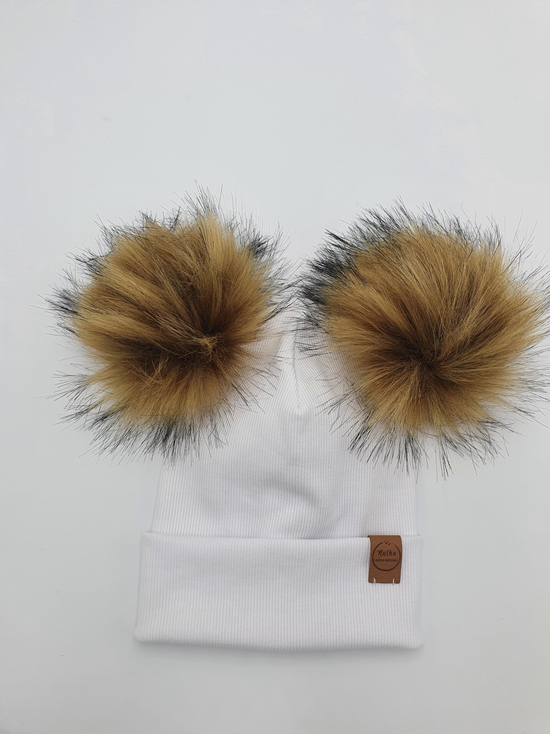 Czapka prążkowana w kolorze białym z jednym lub dwoma pomponami. Możliwość podszycia polarem.