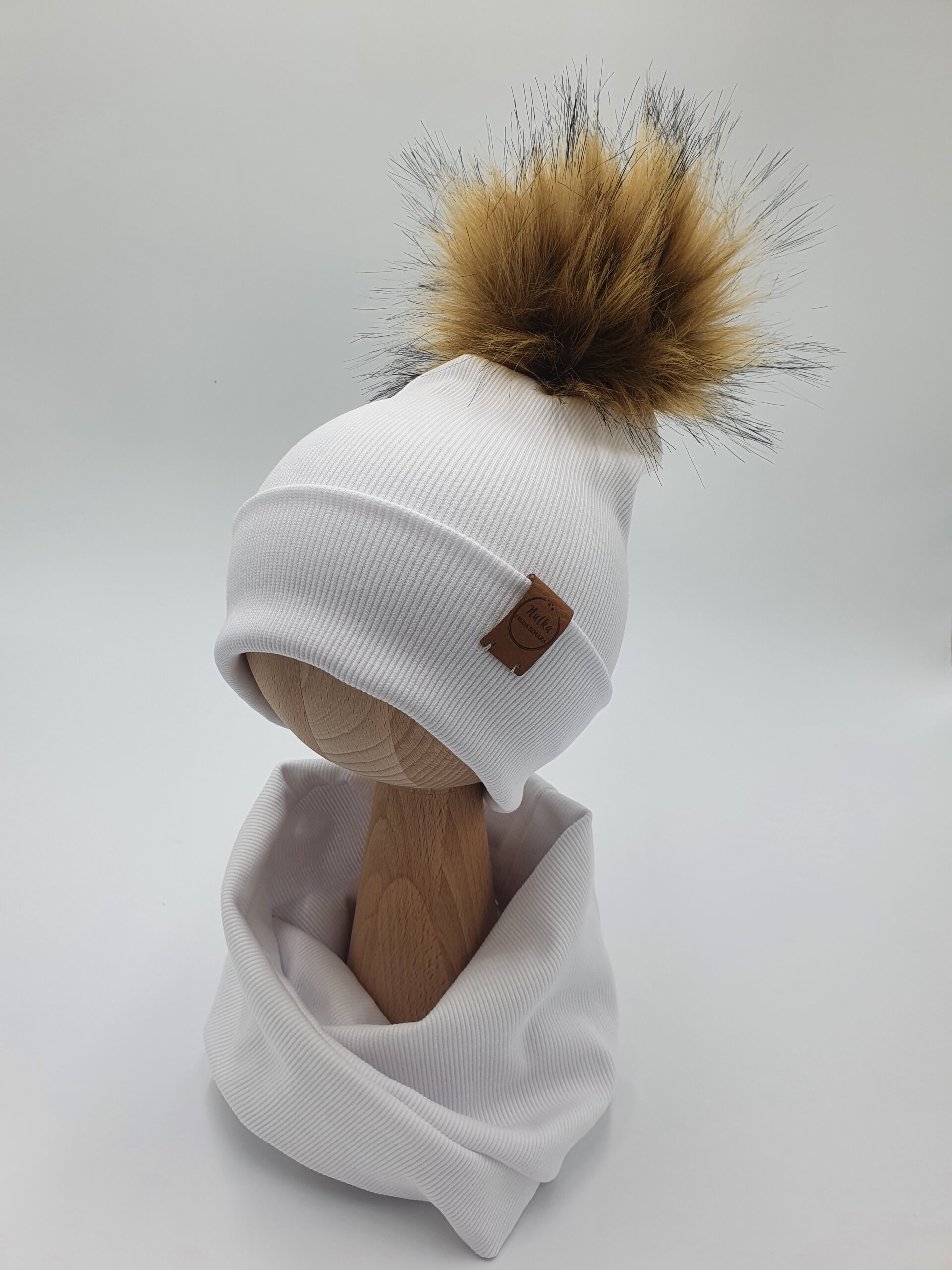 Czapka prążkowana w kolorze białym z jednym lub dwoma pomponami. Możliwość podszycia polarem.