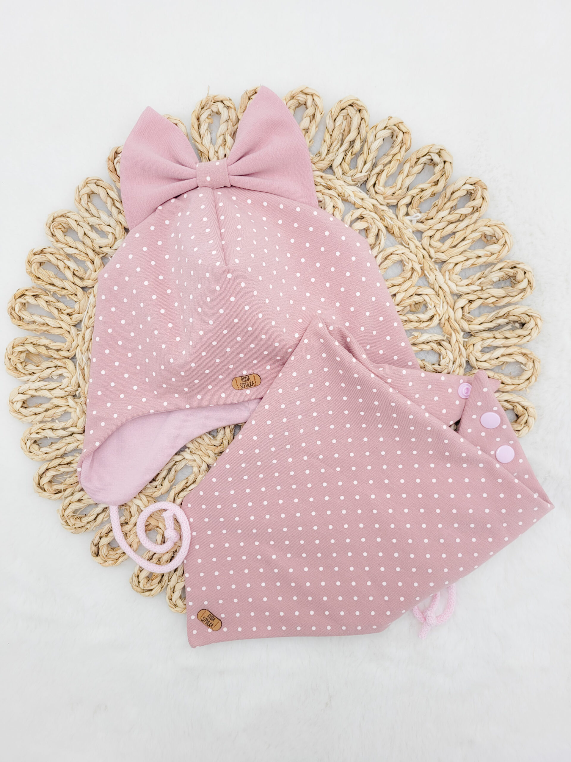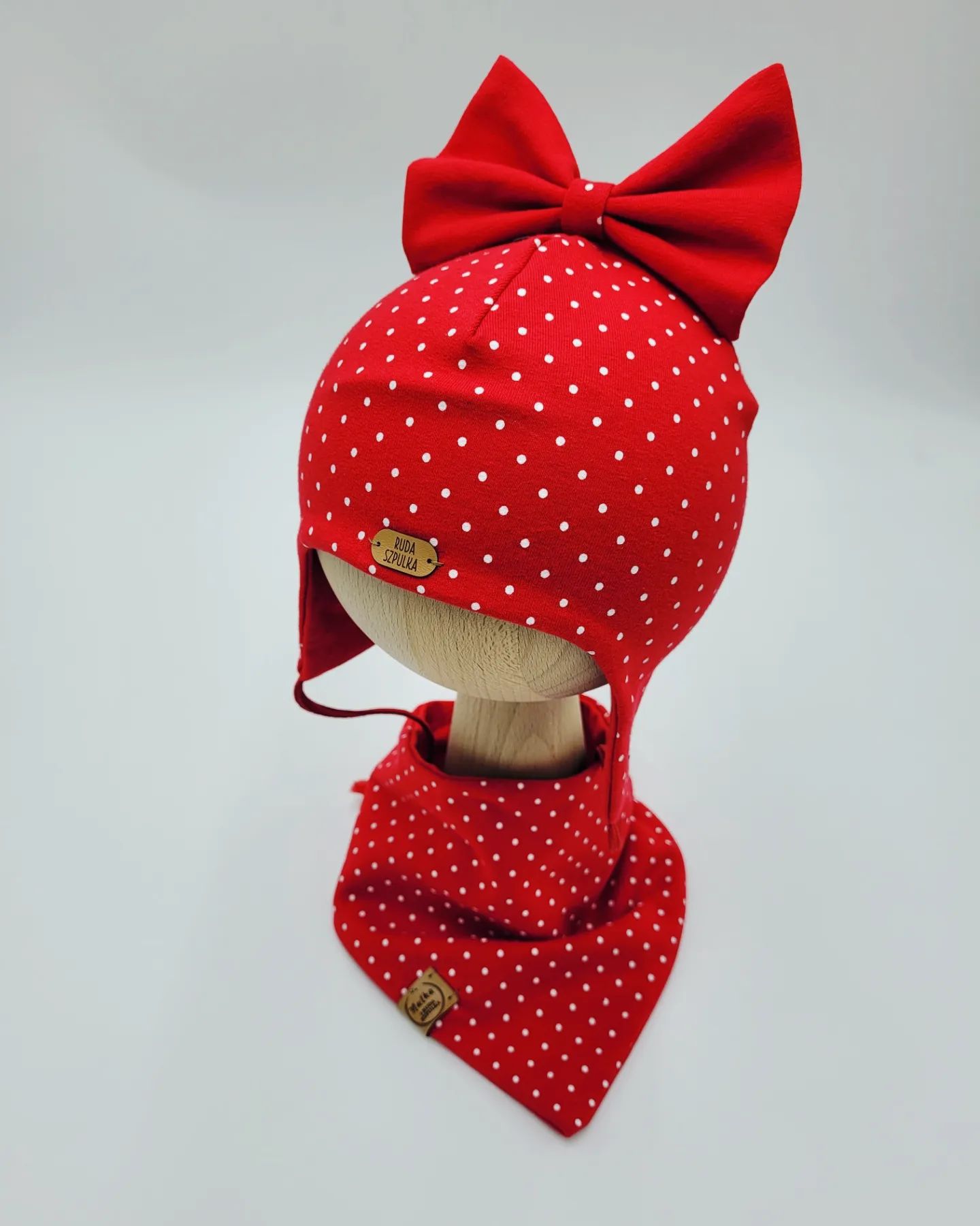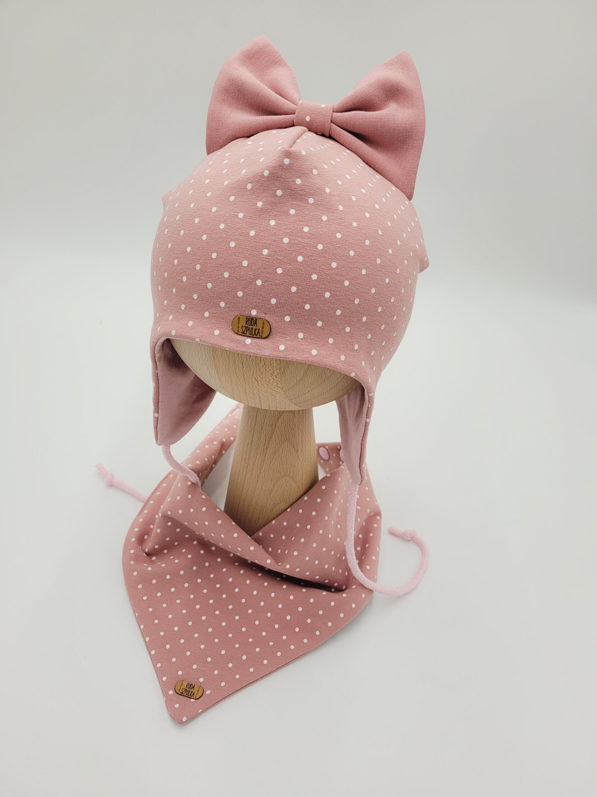 Wiązana czapka pilotka idealnie osłoni uszka malucha od wiatru i chłodu. Do wyboru masz białe kropeczki na tle w siedmiu różnych kolorach. Piękna kokardka w pasującym kolorze sprawia, że całość prezentuje się niezwykle dziewczęco. Do kompletu możesz wybrać chustę Mini zapinaną na napki, chustę wiązaną Maxi lub klasyczny komin. Dla noworodków i niemowląt polecamy chustę Baby – jest ona wyprofilowana pod szyją tak, aby nic nie uwierało maluszka. Zarówno czapka jak i komin czy chusta uszyte są z dwóch warstw materiału. Możesz również ozdobić chustę koronką lub falbanką.