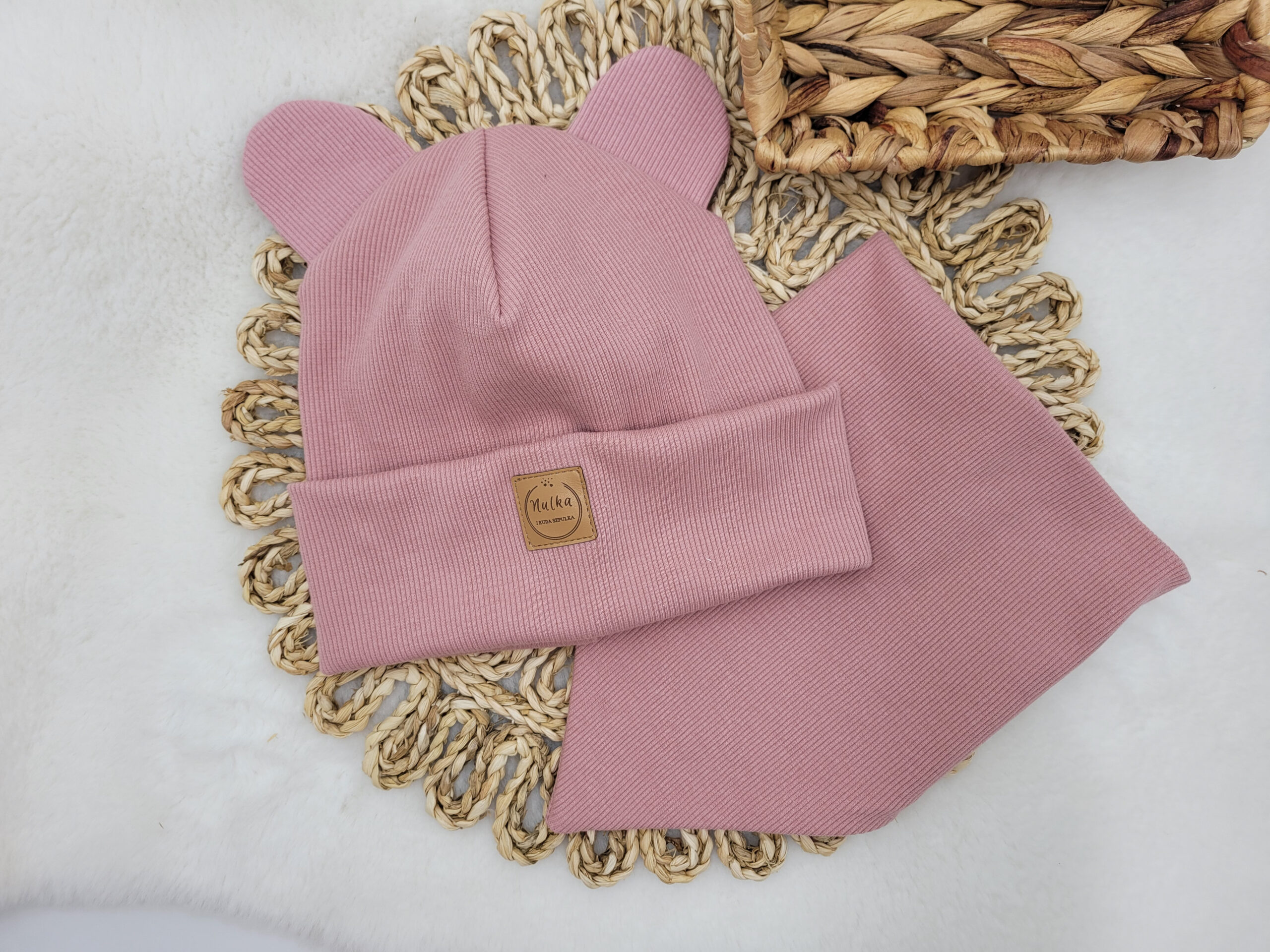 Prosta lub wywijana czapka z dzianiny prążkowanej ozdobiona misiowymi uszami w kolorze brudnego różu. Możliwe wiązanie i dodatkowe kokardki.