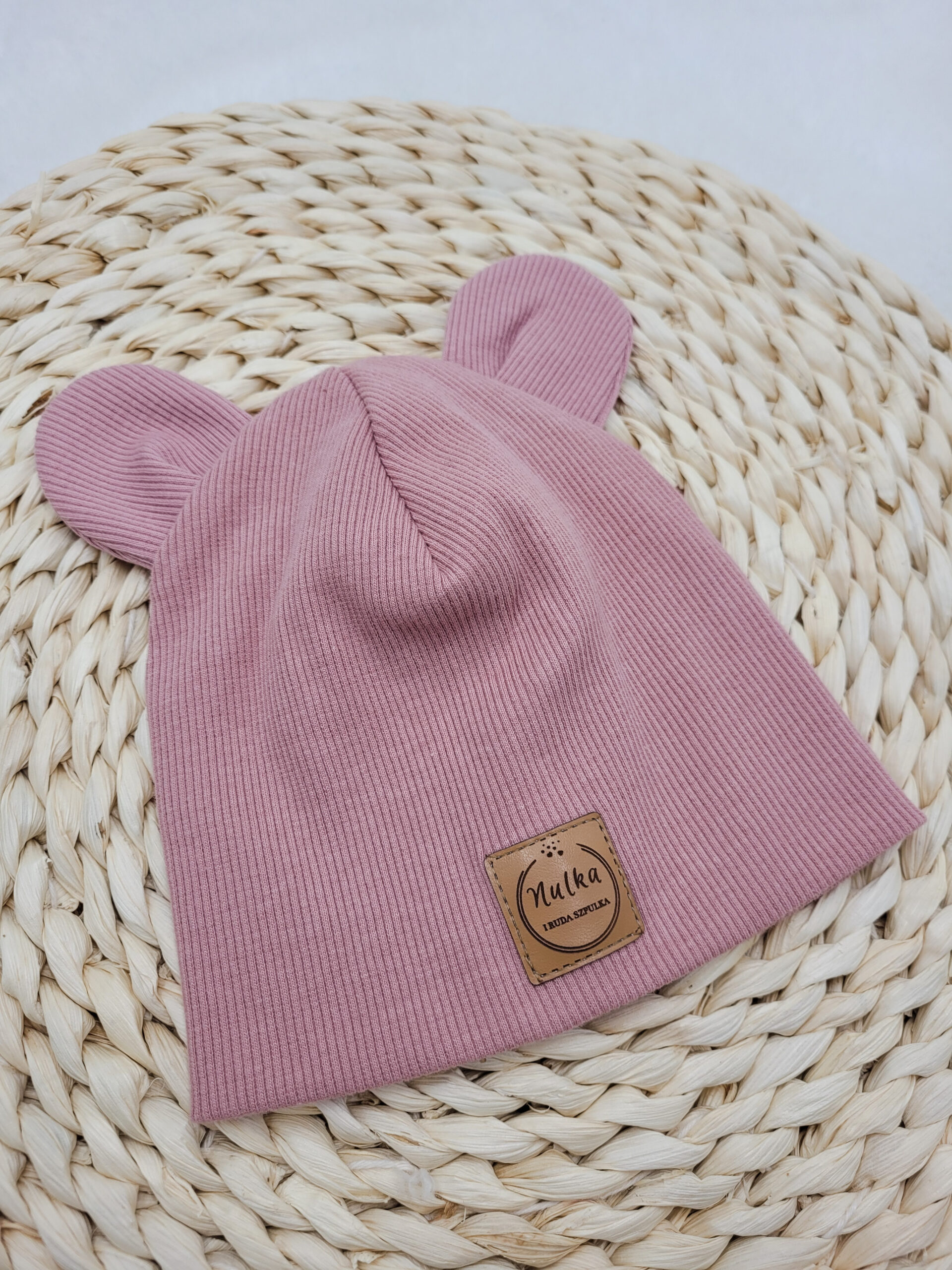 Przepiękna czapka ozdobiona misiowymi uszami w kolorze brudnego różu. Do wyboru model prosty lub cieplejszy wywinięty. Czapka dzięki wywinięciu rośnie razem z dzieckiem. Czapki szyte z elastycznej, przyjemnej dzianiny prążkowanej.