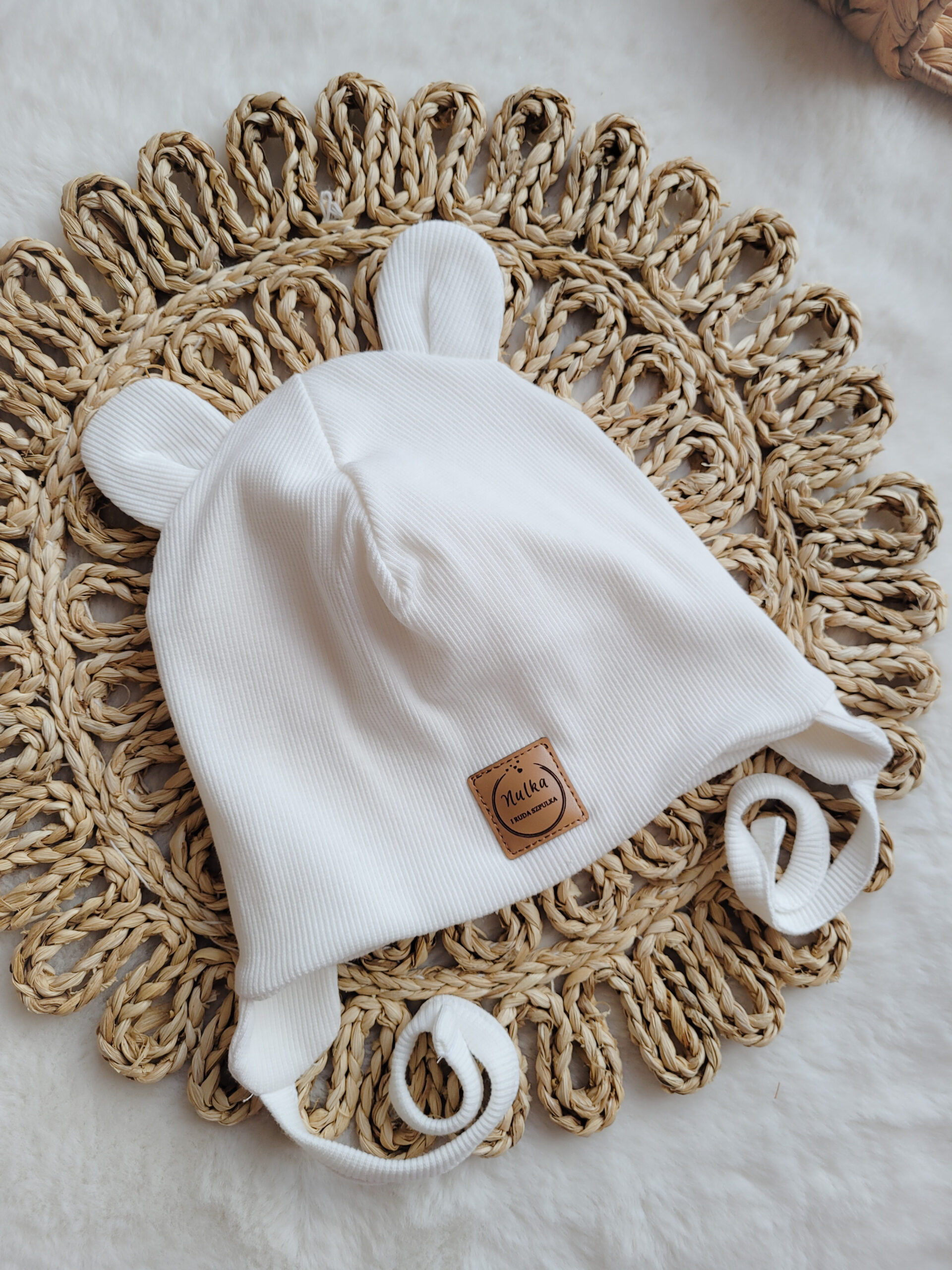 Prosta lub wywijana czapka z dzianiny prążkowanej ozdobiona misiowymi uszami w kolorze ecru. Możliwe wiązanie i dodatkowe kokardki.