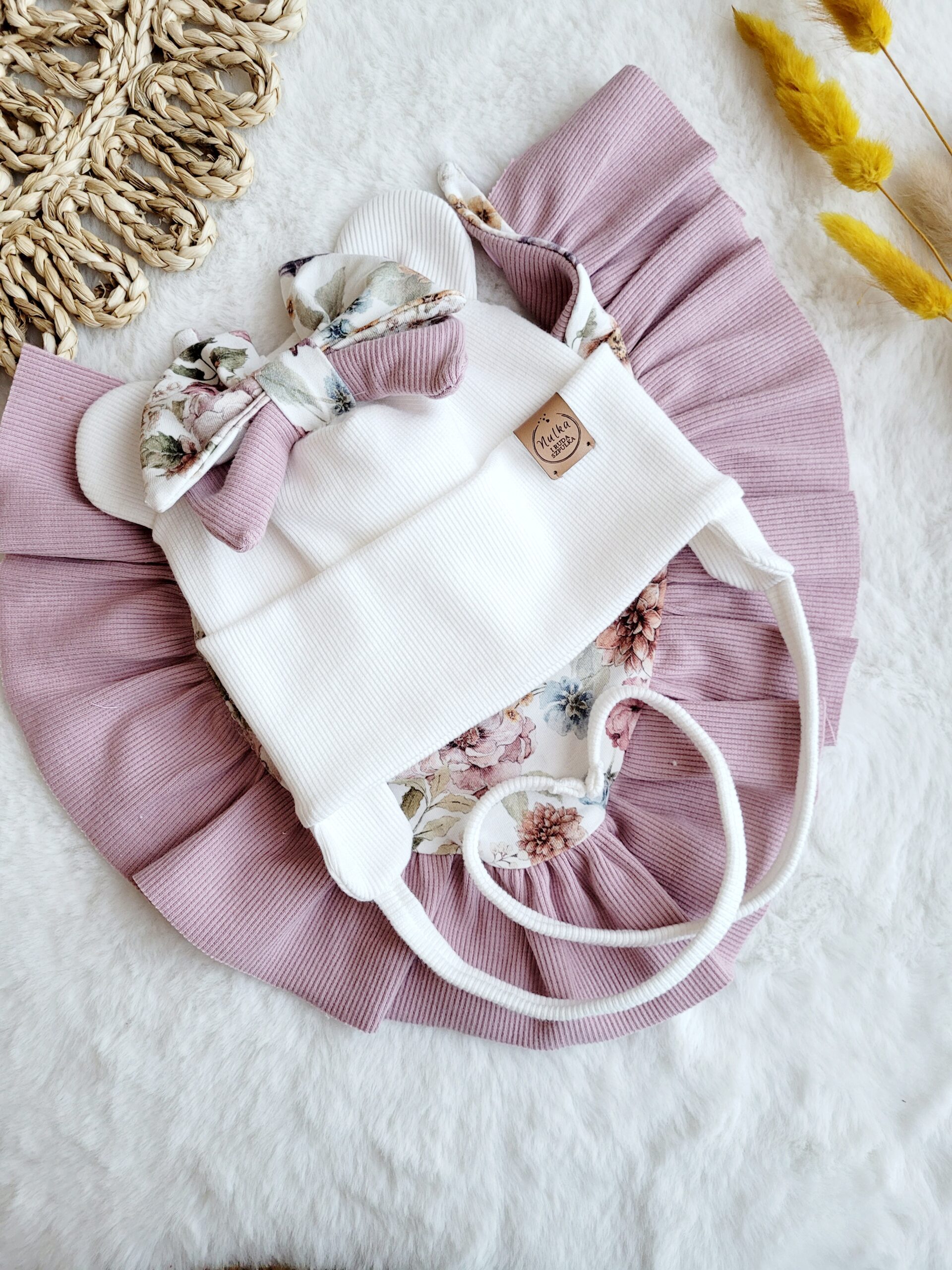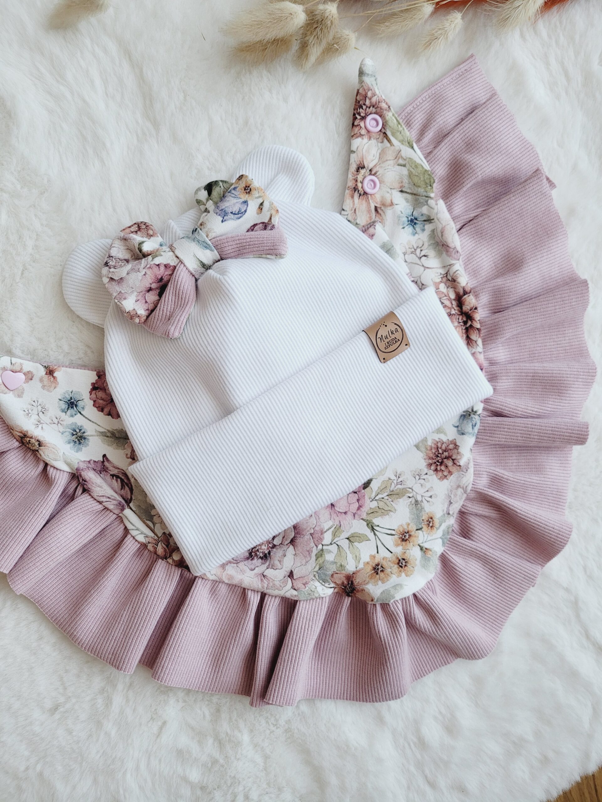 Czapka i chusta z motywem piwoniito idealny wybór zarówno na co dzień, jak i na specjalne okazje. Stylowe detale, jak perełki, kokardka i falbanki, sprawiają, że ten zestaw to must-have w garderobie każdej małej damy. Zestaw idealny na wiosnę i jesień.