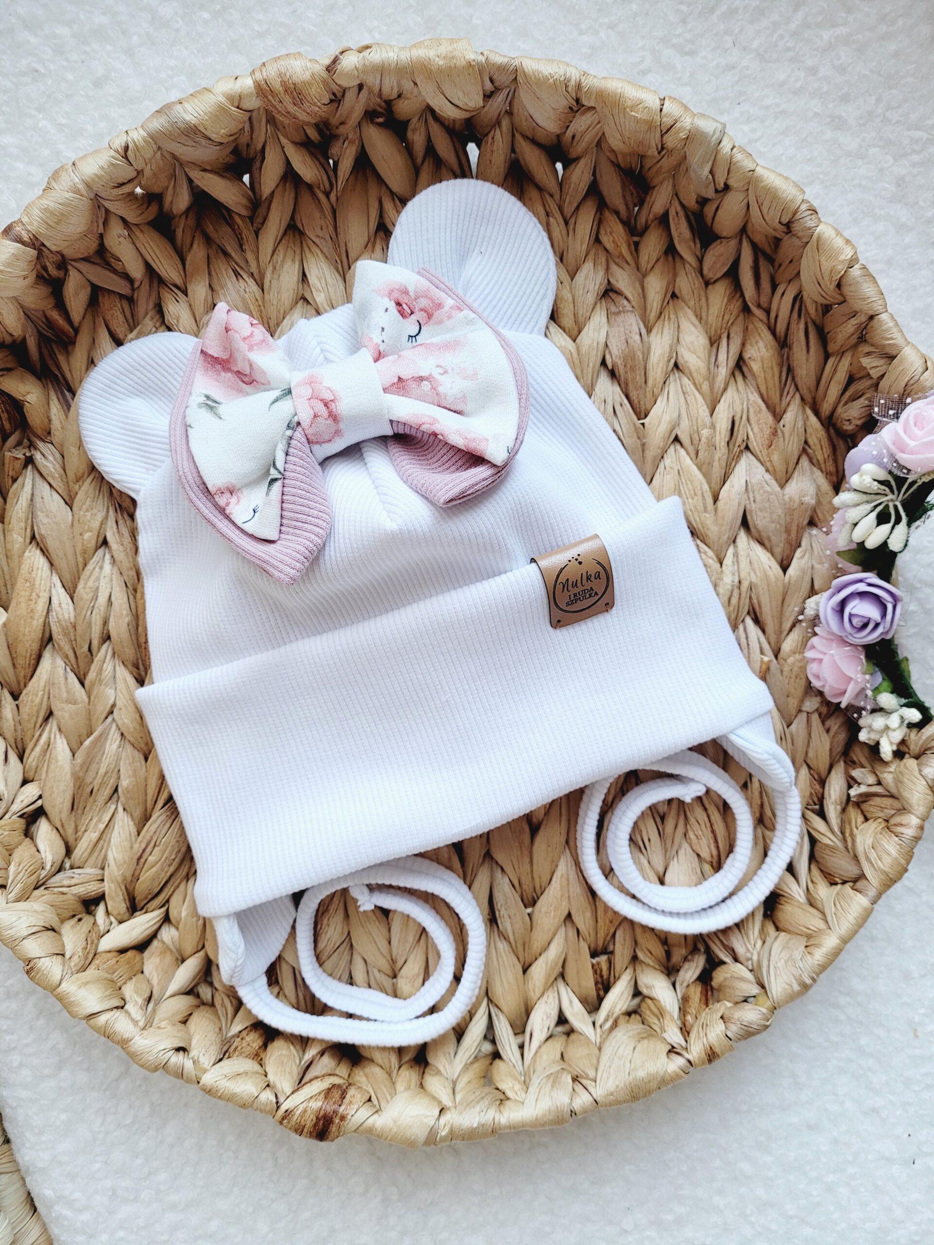Czapka i chusta dla dziewczynki z motywem Peony – uroczy zestaw z uszkami i kokardką