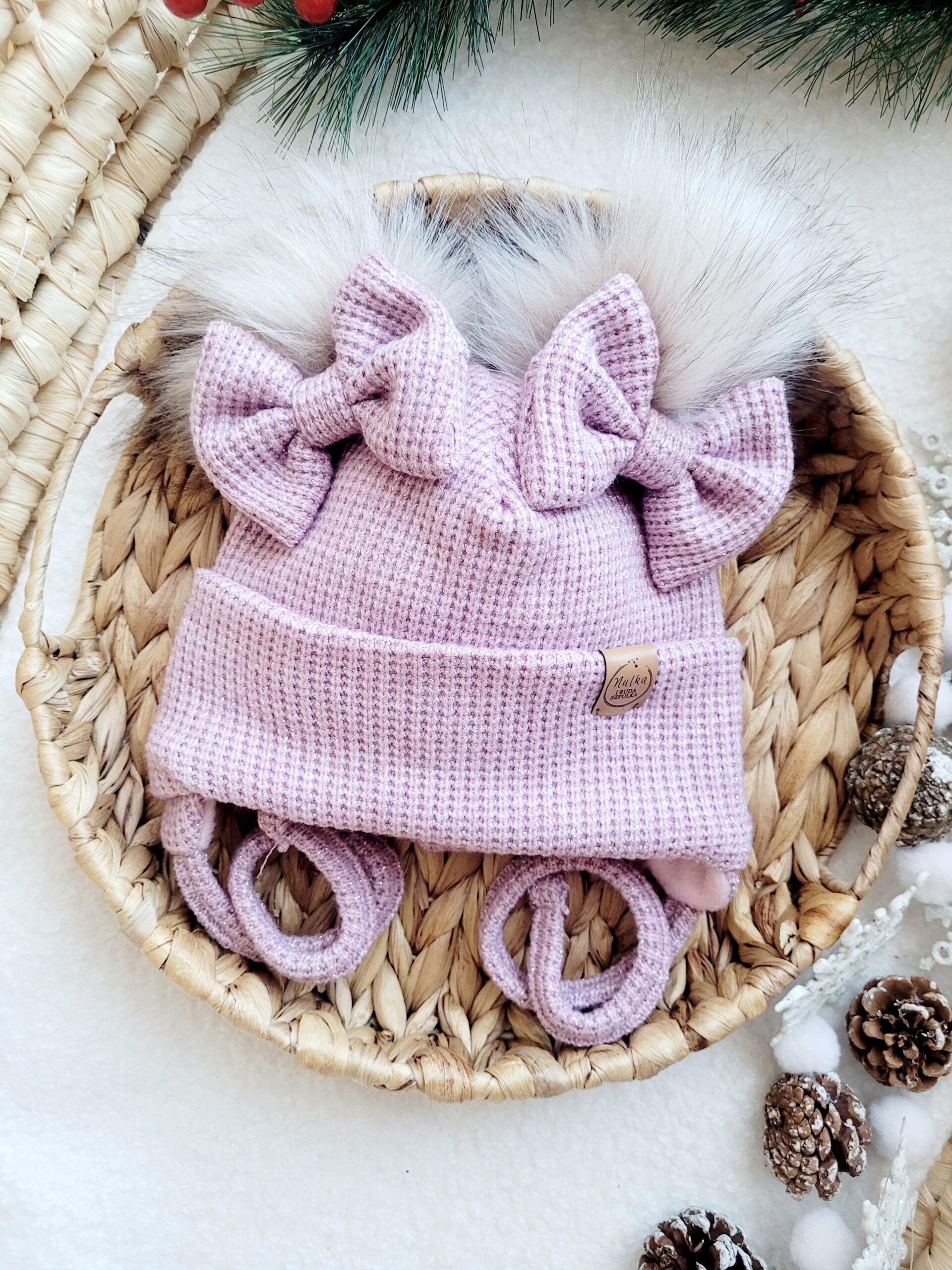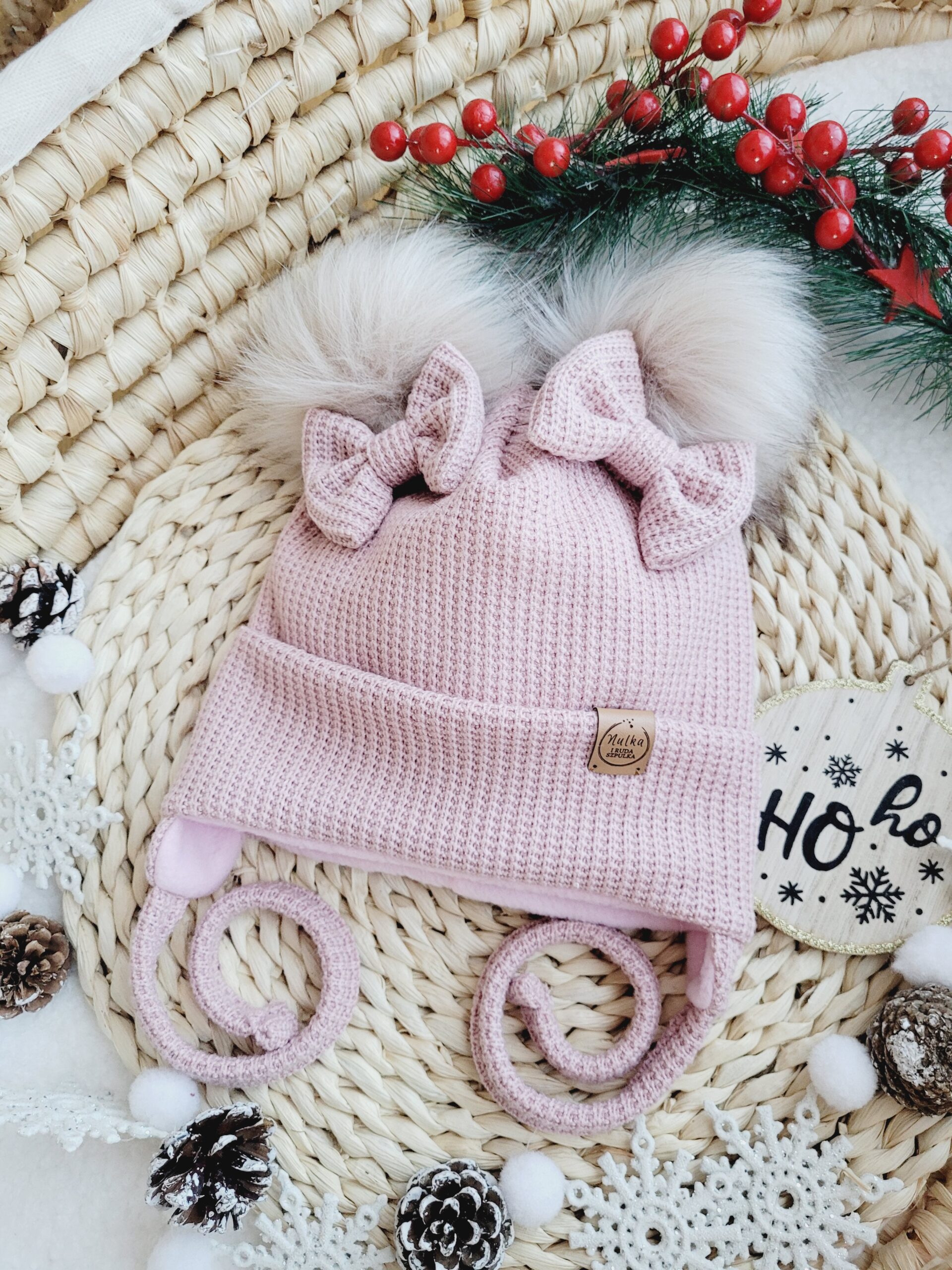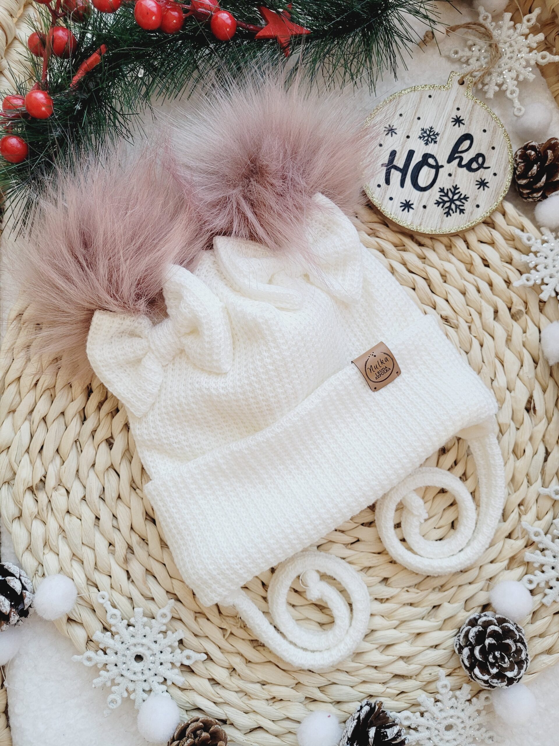 Czapka została ozdobiona dwoma ręcznie robionymi pomponami, które dodają jej uroku i sprawiają, że jest naprawdę wyjątkowa. Dodatkowo kokardki dopasowane kolorystycznie do czapki podkreślają jej dziewczęcy styl. Możesz też poprosić o uszycie kokardek w innym kolorze – wystarczy, że zostawisz wiadomość w uwagach przy składaniu zamówienia.