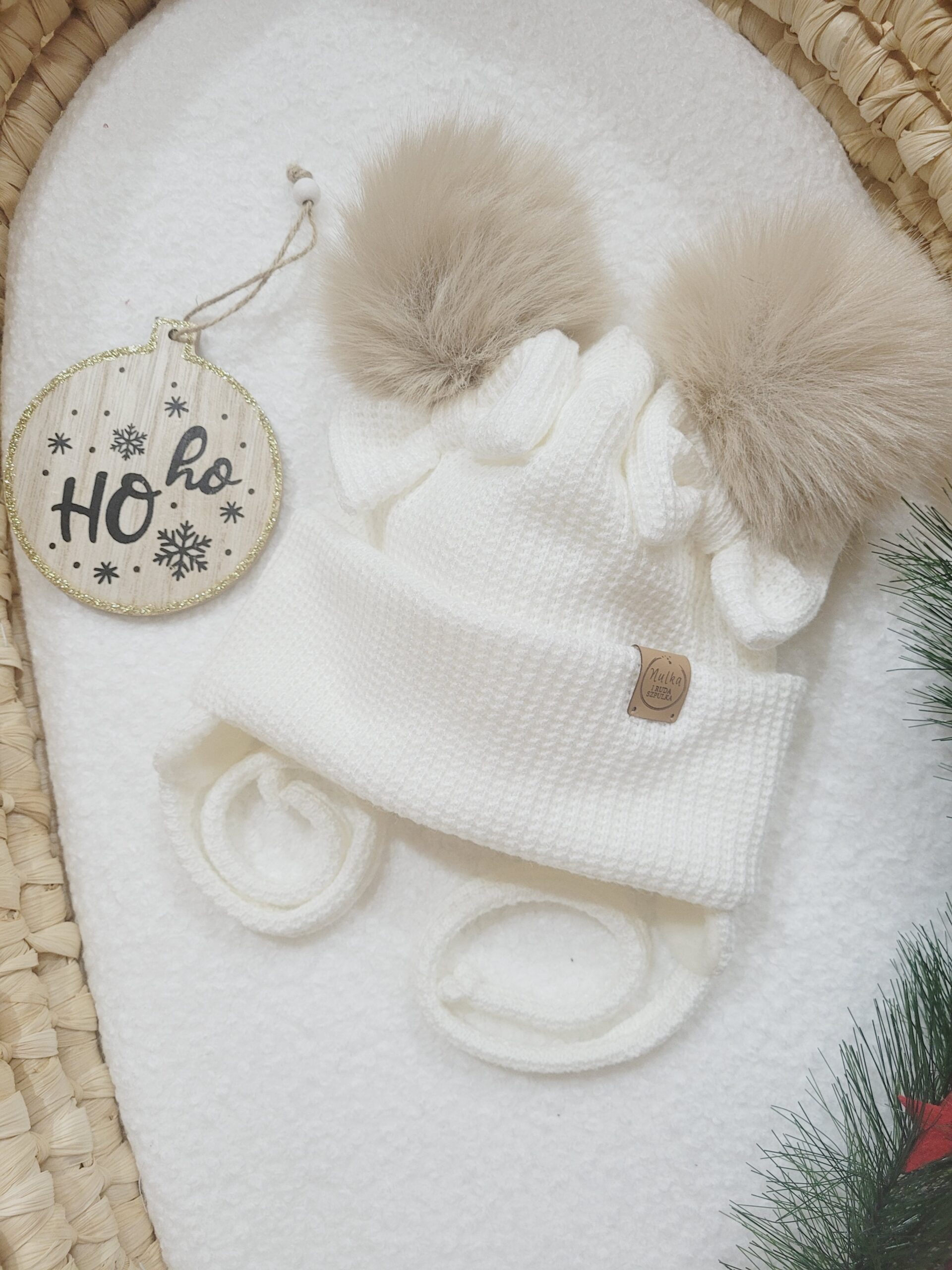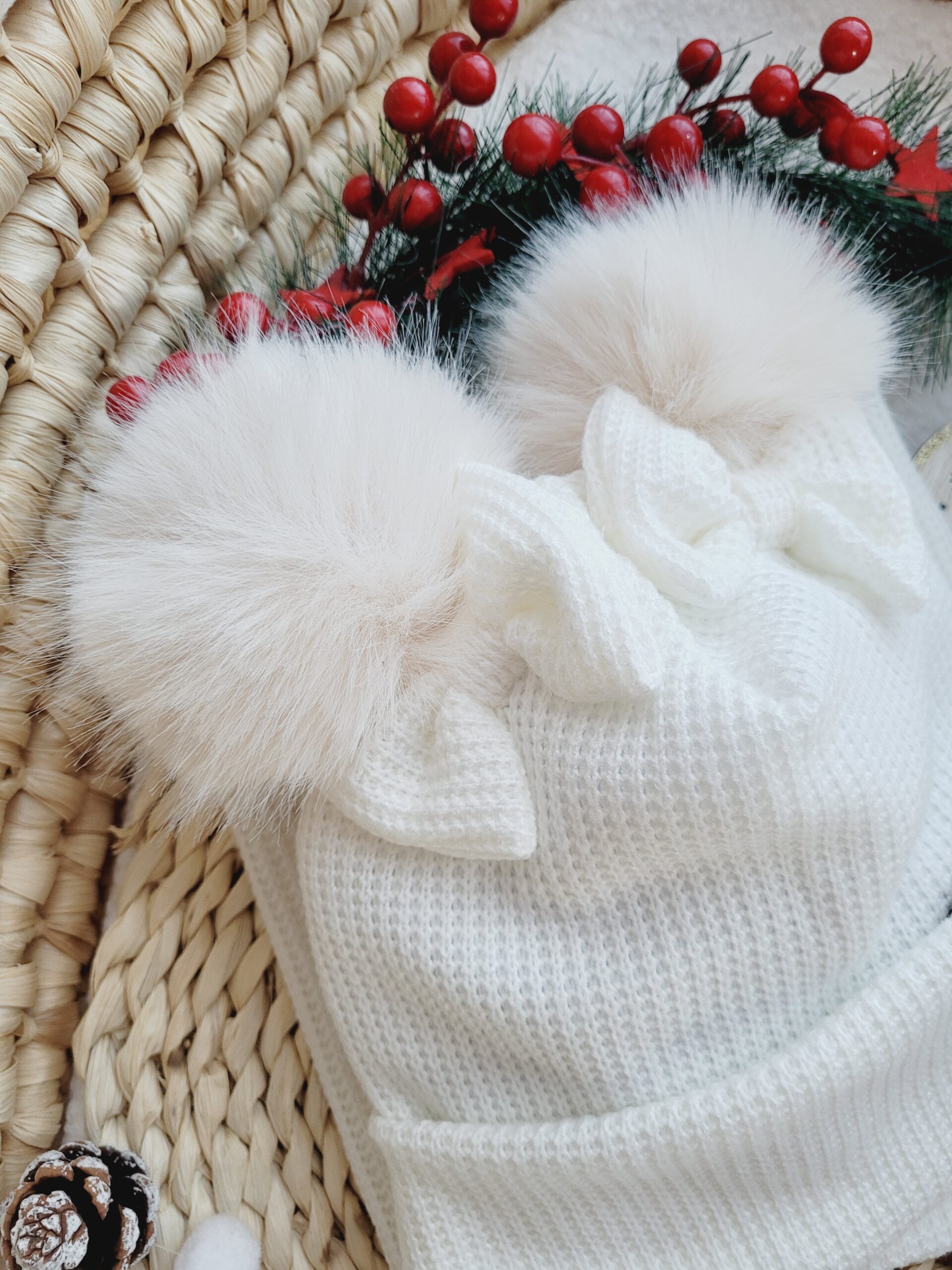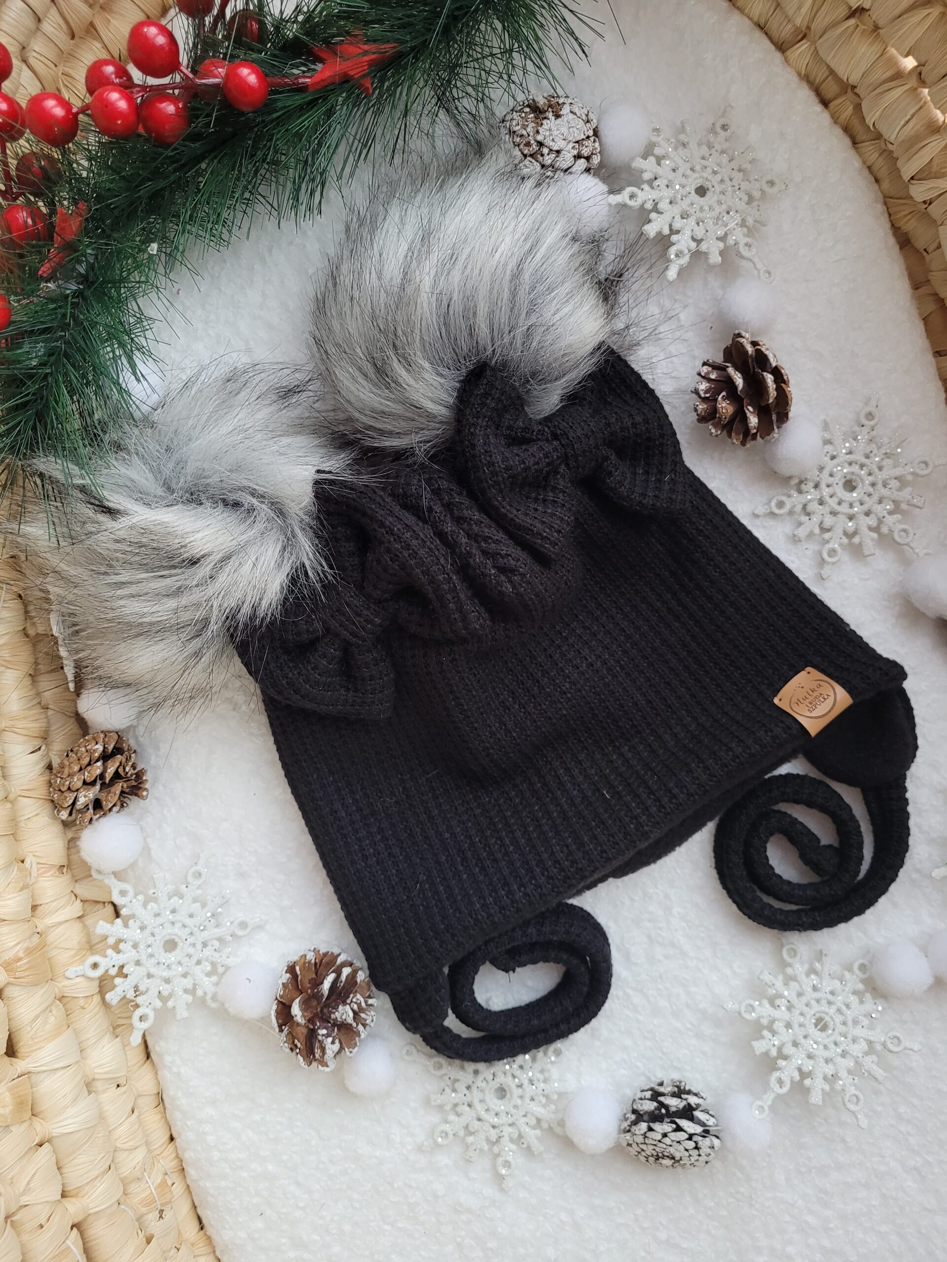 Czapka została ozdobiona dwoma ręcznie robionymi pomponami, które dodają jej uroku i sprawiają, że jest naprawdę wyjątkowa. Dodatkowo kokardki dopasowane kolorystycznie do czapki podkreślają jej dziewczęcy styl. Możesz też poprosić o uszycie kokardek w innym kolorze – wystarczy, że zostawisz wiadomość w uwagach przy składaniu zamówienia.