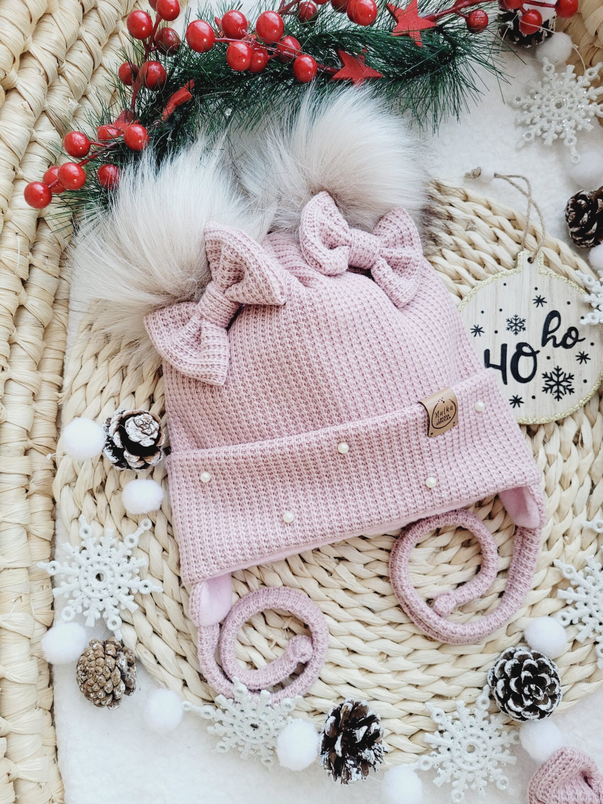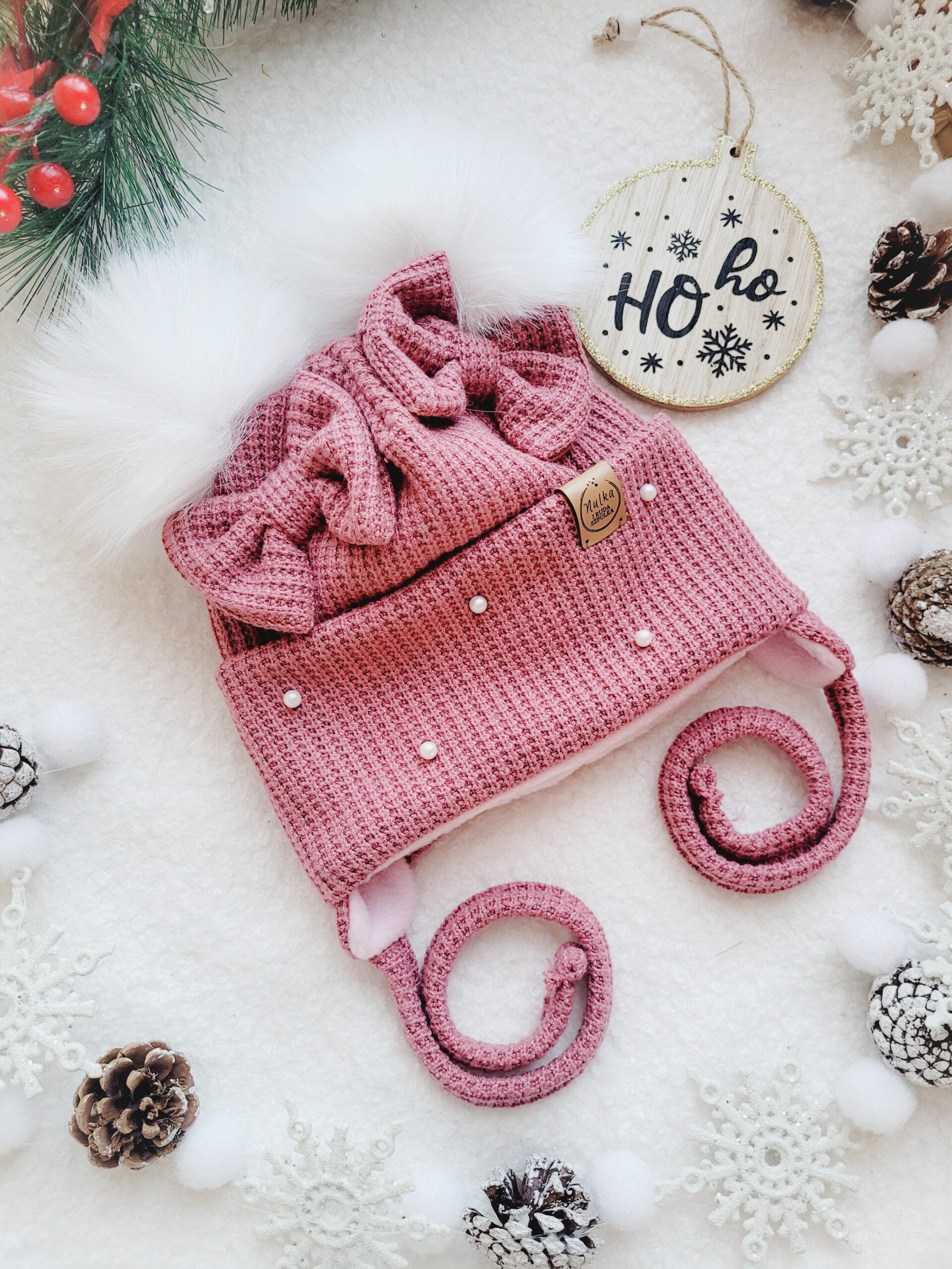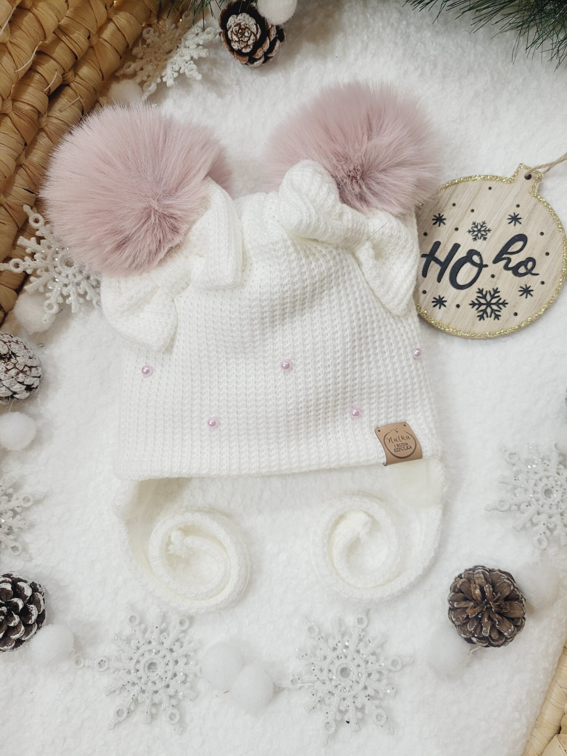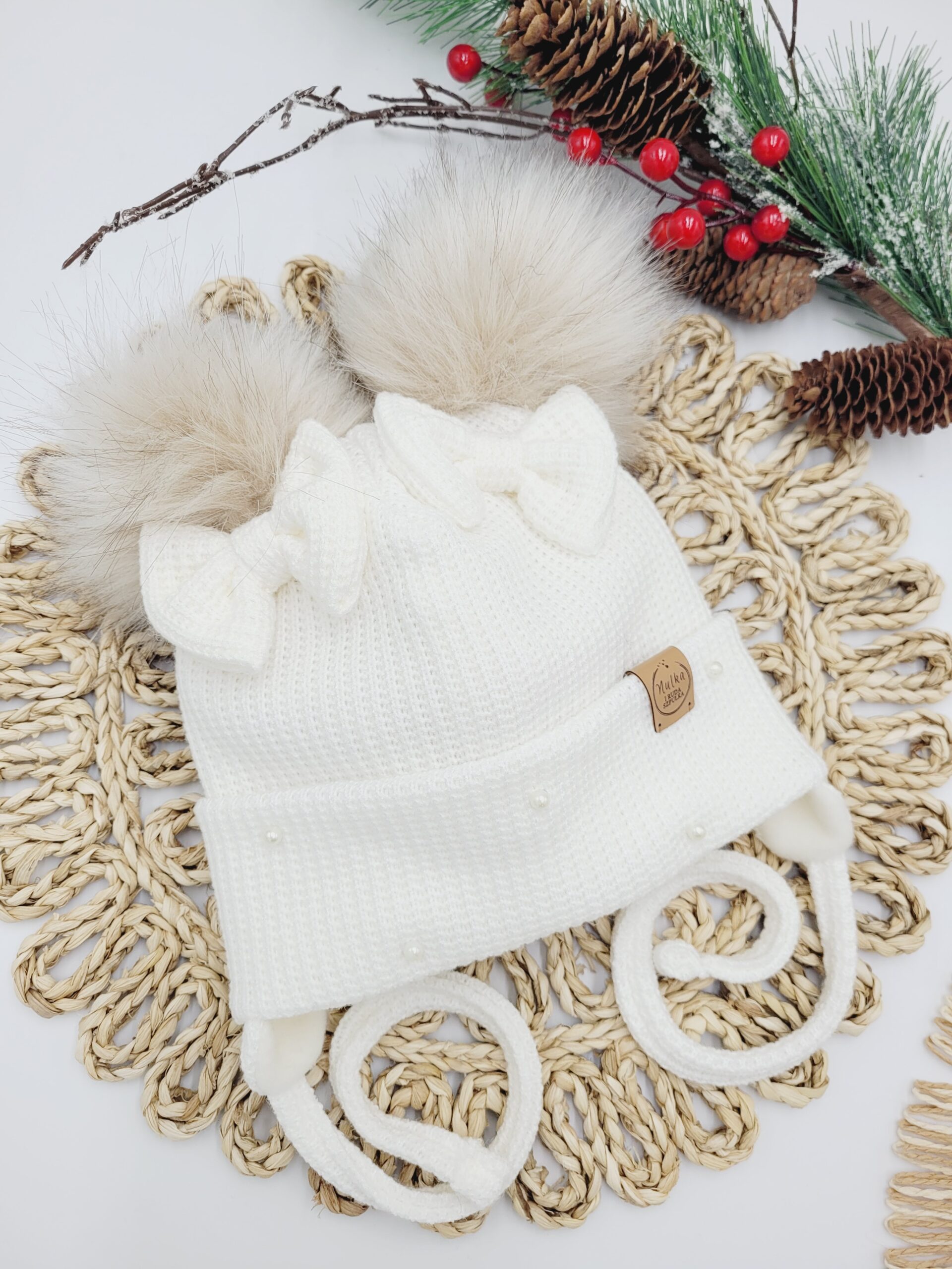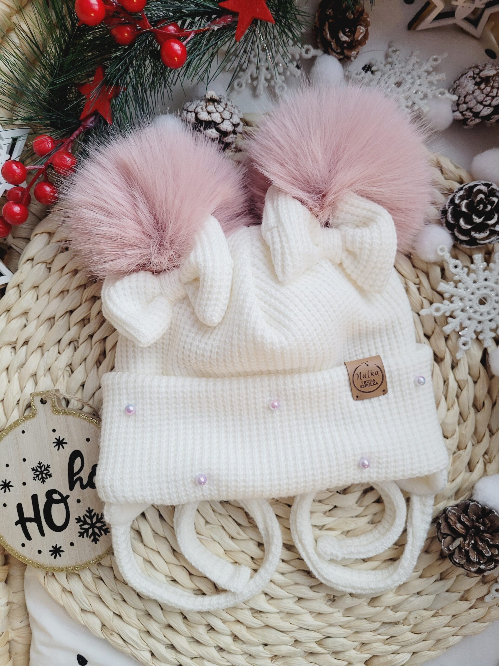 Zimowa czapka wiązana dla dziewczynki w wybranym kolorze ozdobiona pomponami, perełkami i kokardkami.