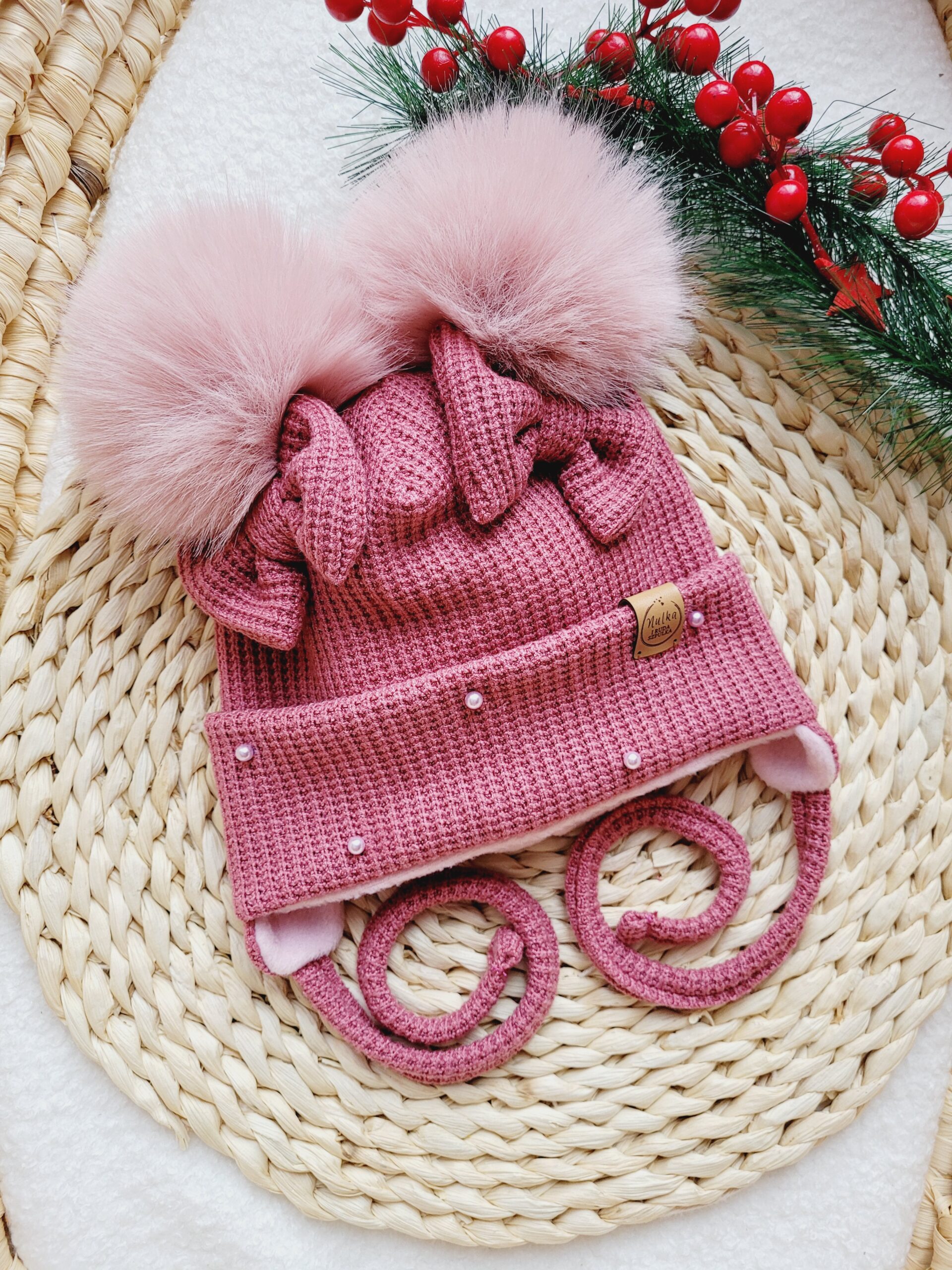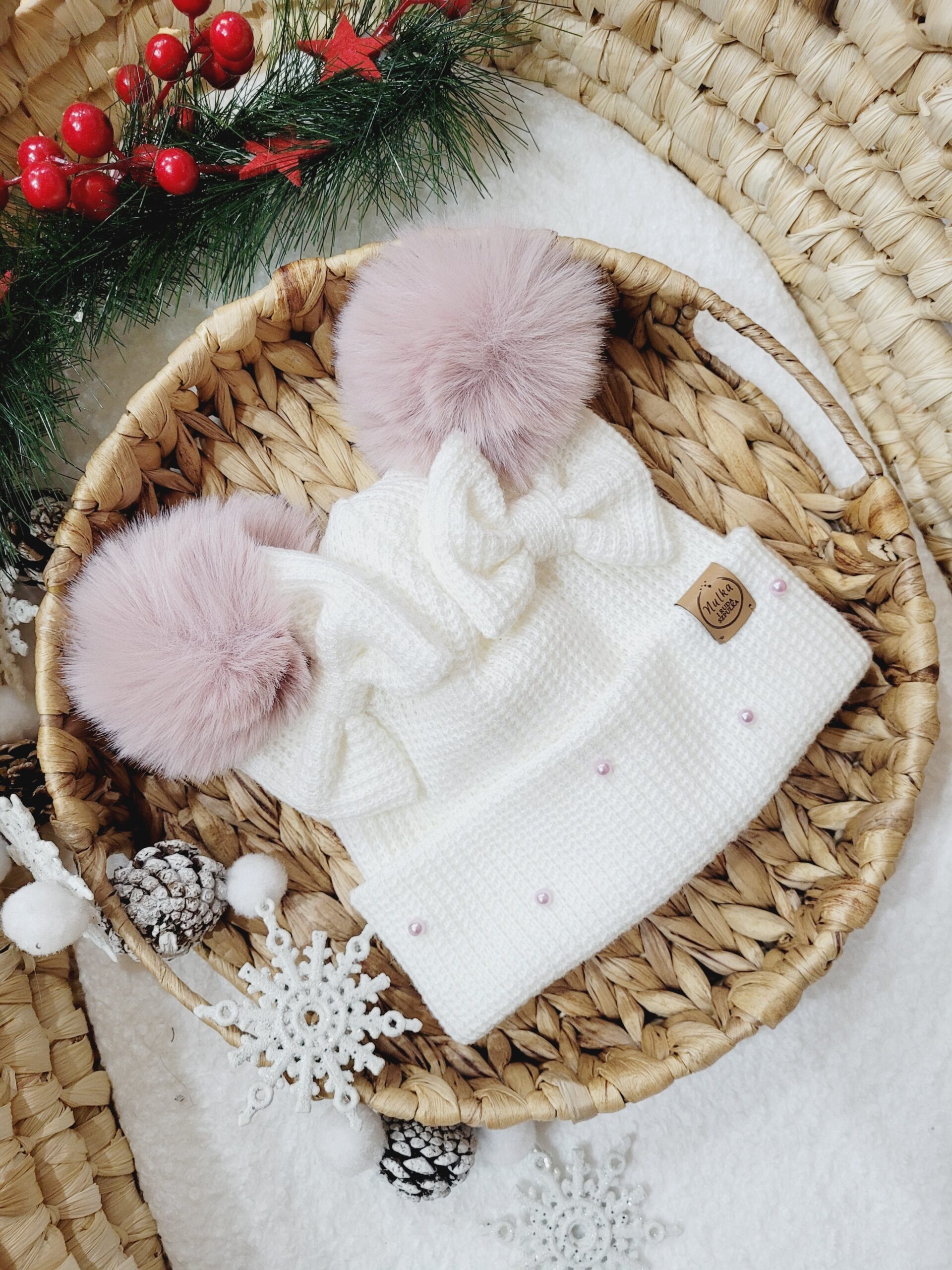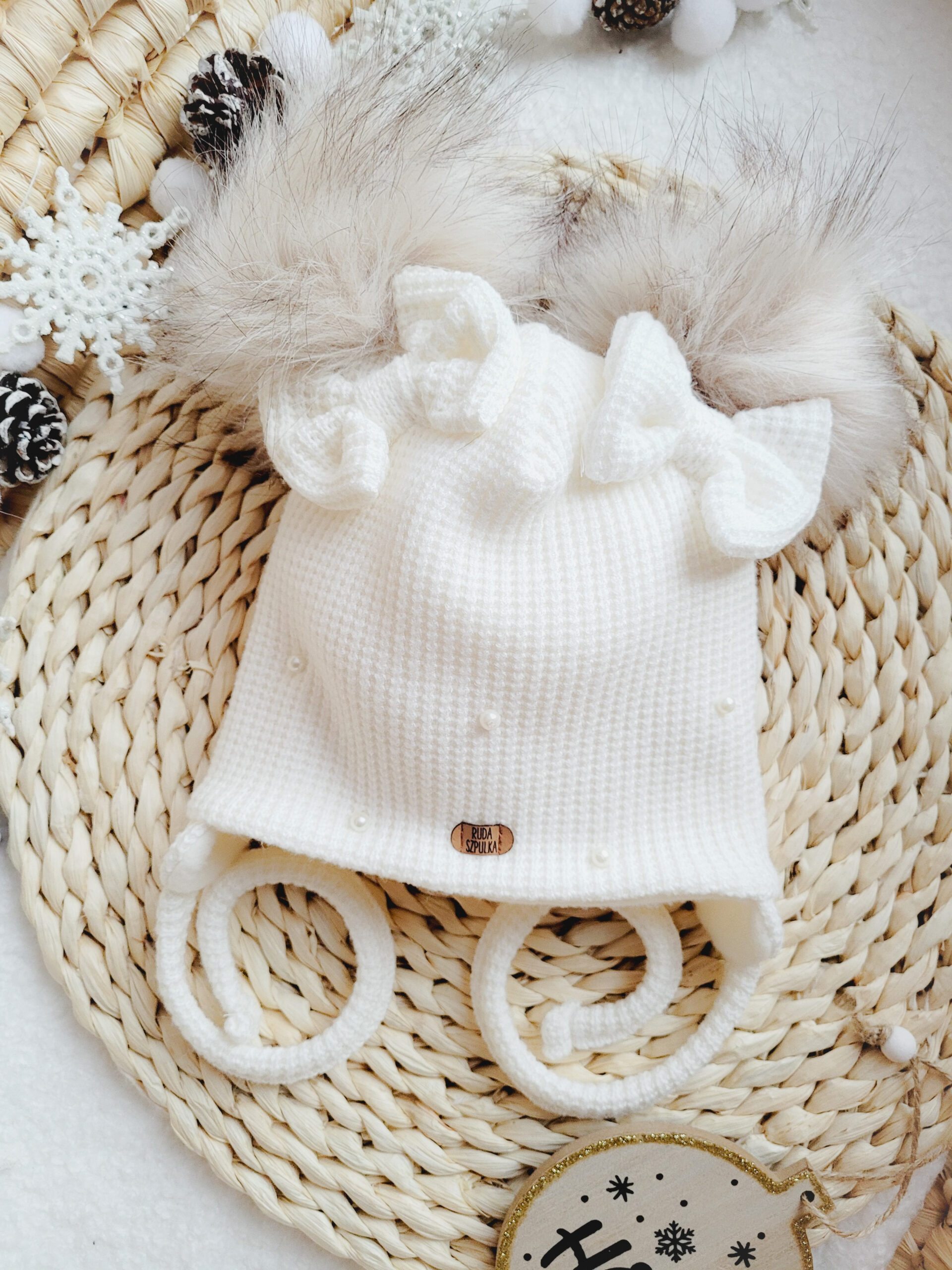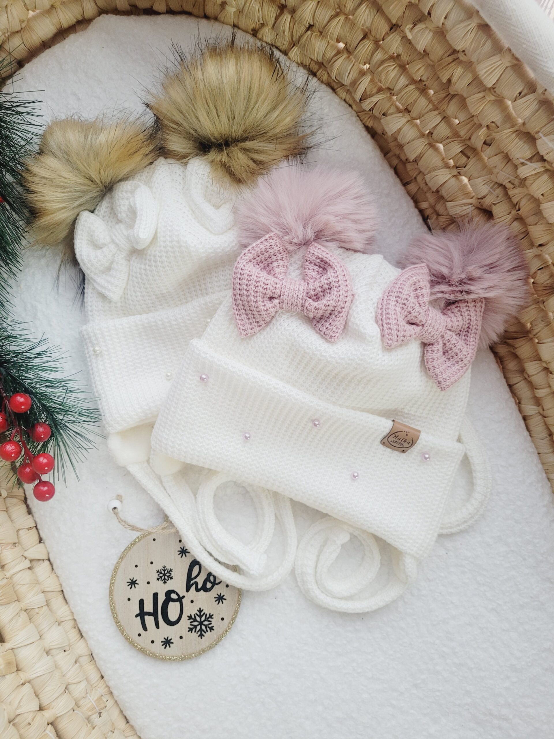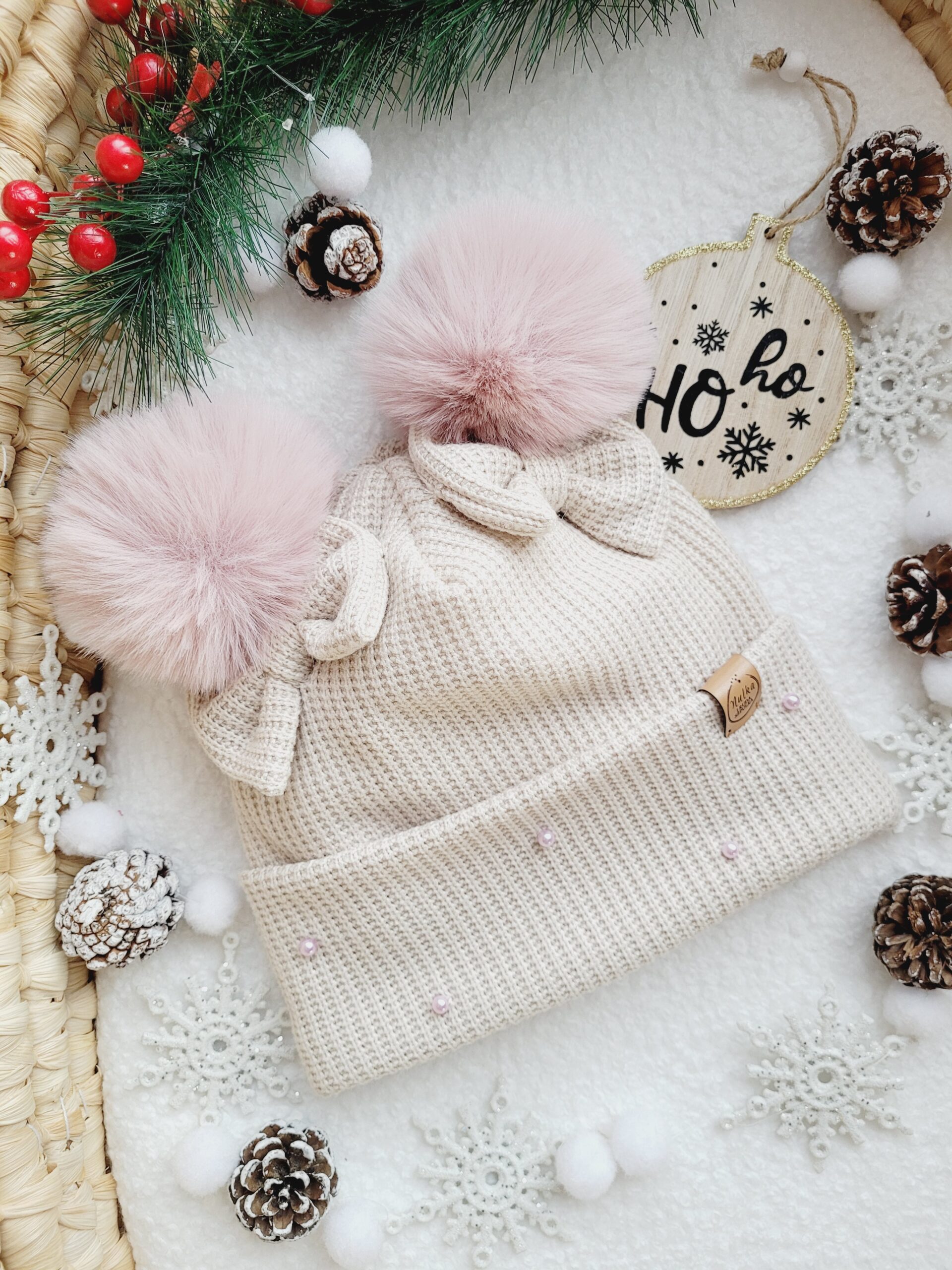 Zimowa czapka wiązana dla dziewczynki w wybranym kolorze ozdobiona pomponami, perełkami i kokardkami.