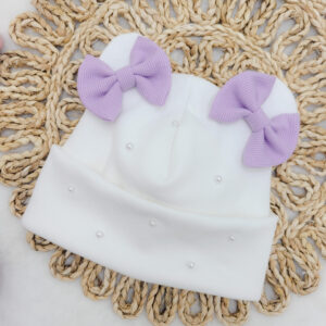 Czapka dostępna jest w wielu kolorach, w tym w różu i błękicie ze srebrną nitką, która subtelnie połyskuje. - Możliwość Zamówienia Kompletów z Pasującymi Ubrankami