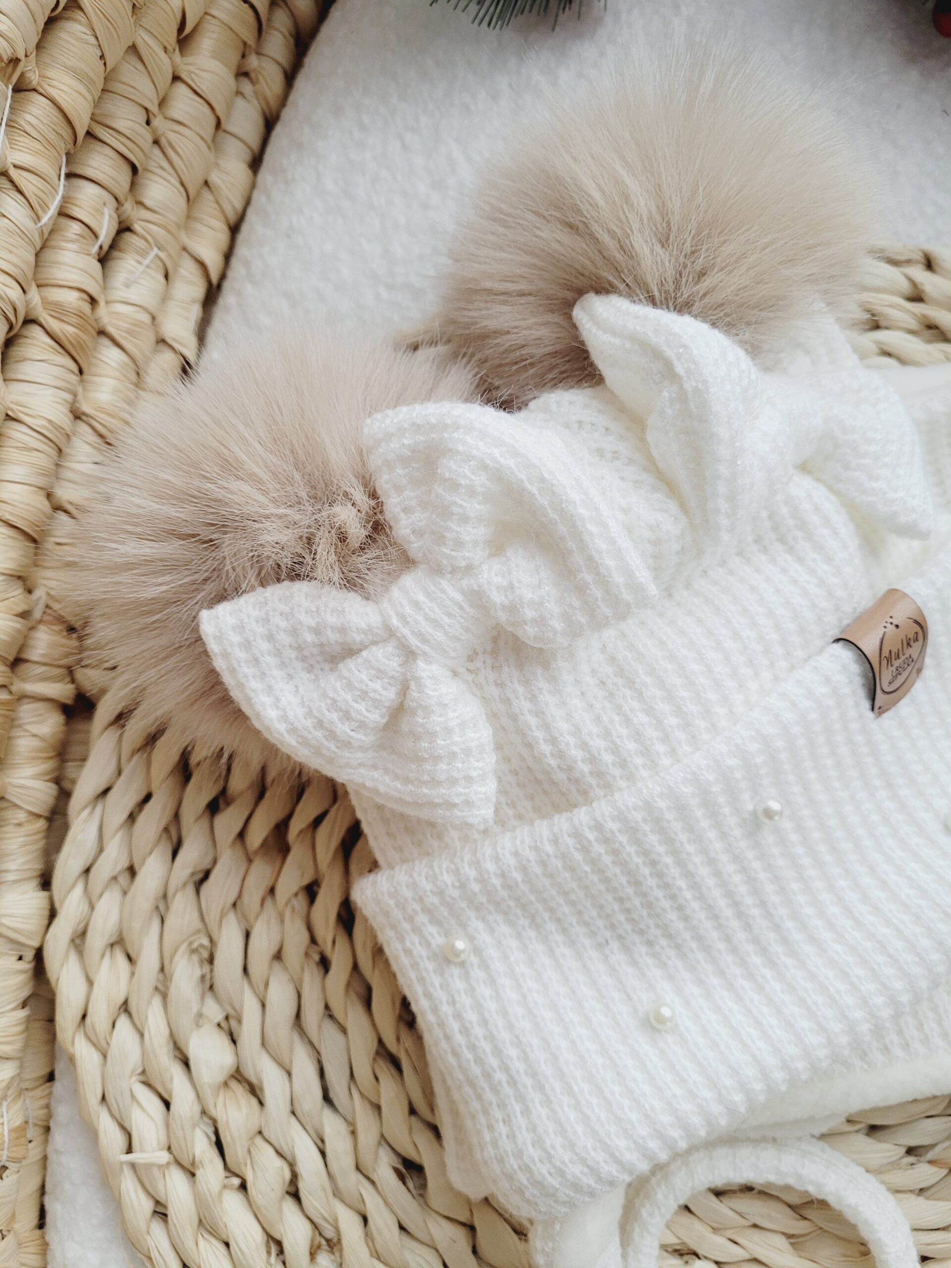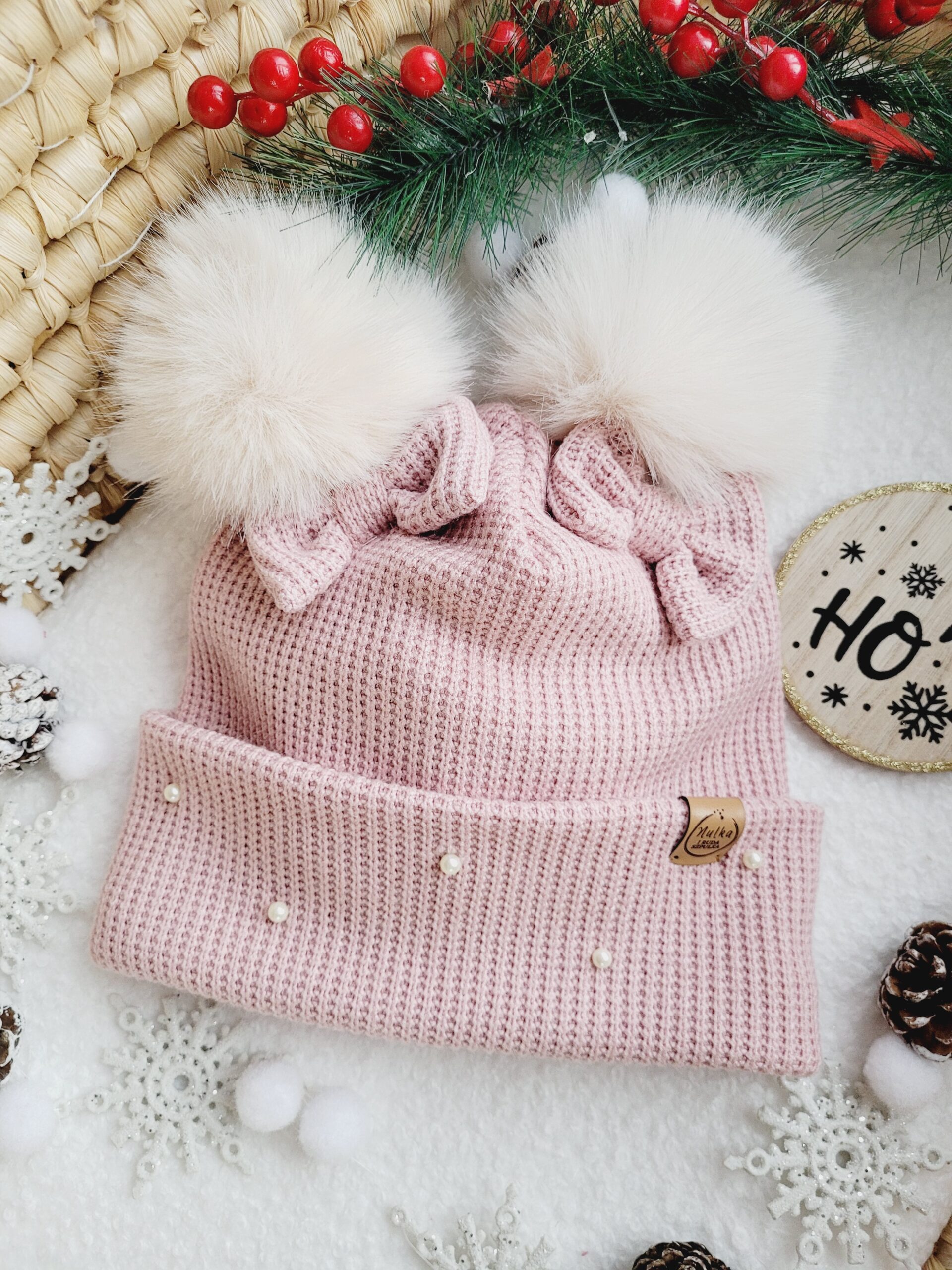 Ta urocza czapka beanie posiada dwa ręcznie robione pompony i pasujące kolorystycznie kokardki, które można dostosować. Jeśli masz pomysł na inny kolor kokardek, wystarczy wspomnieć o tym w zamówieniu. Zdobienie perełkami dodaje elegancji – również ich kolor można dopasować.